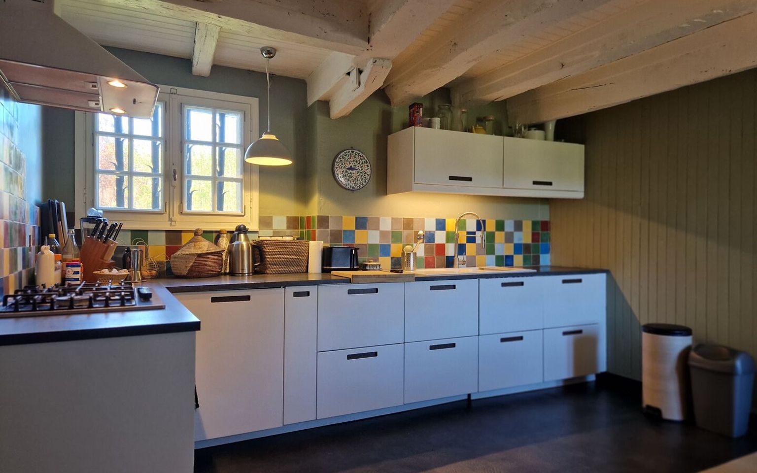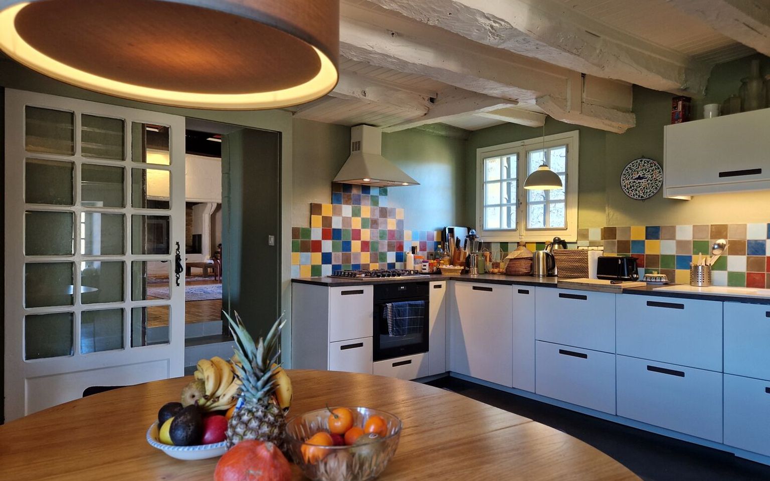 Cuisine(s) 18,60m2 cuisine aménagée et équipée, plan strat, carreaux de ciment, sol parquet, plafond poutres