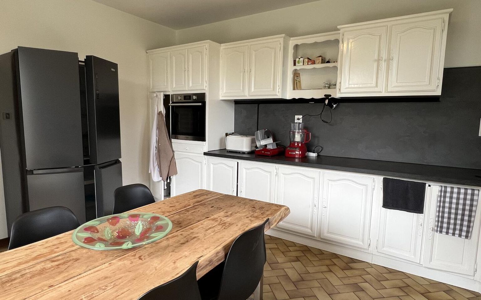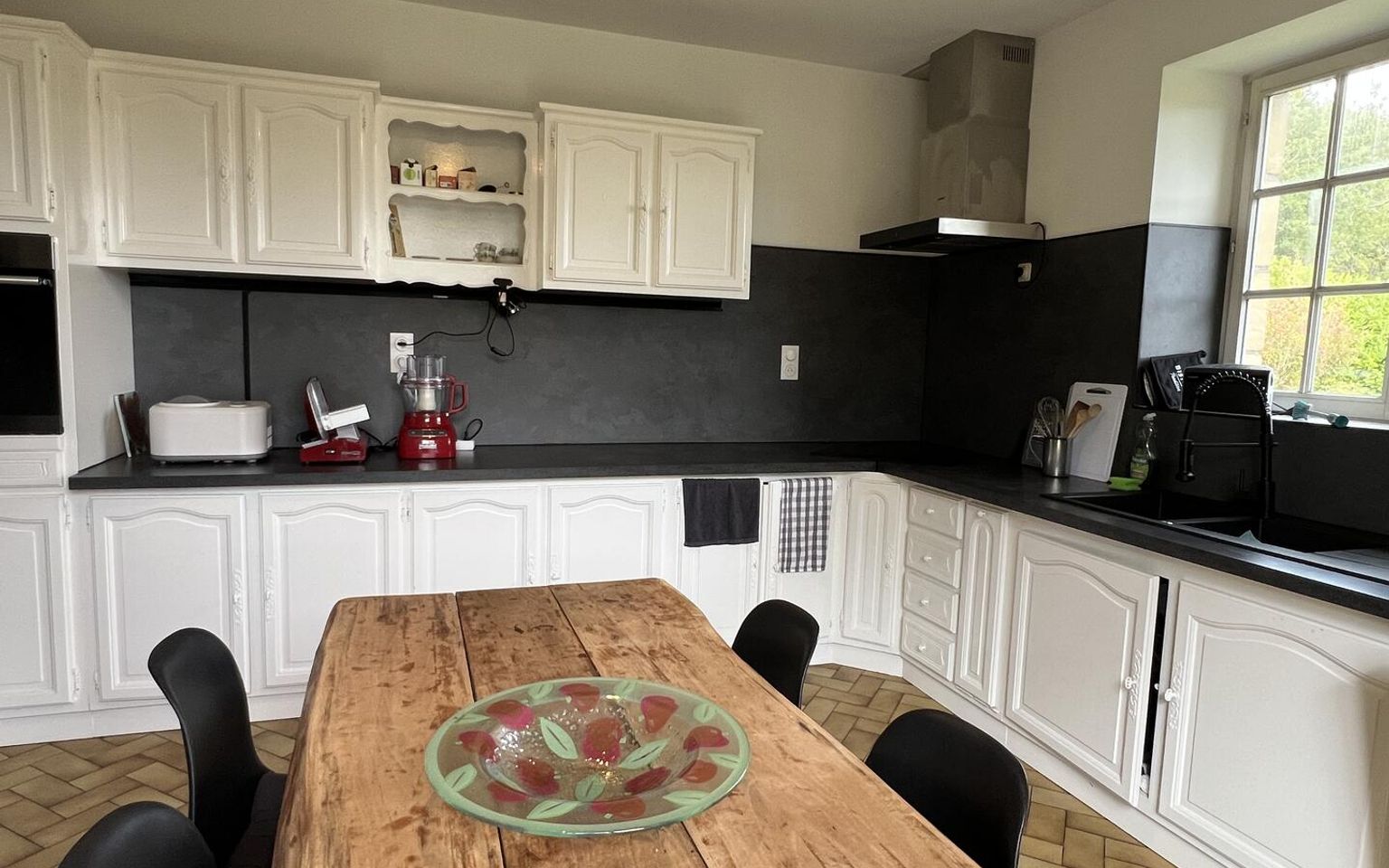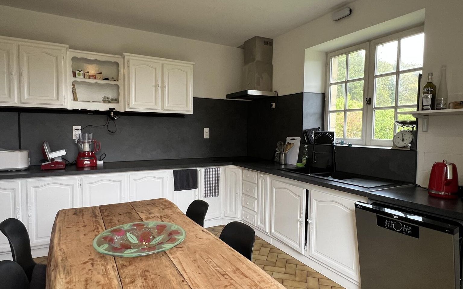 Cuisine(s) de 17 m² avec portes-fenêtres.