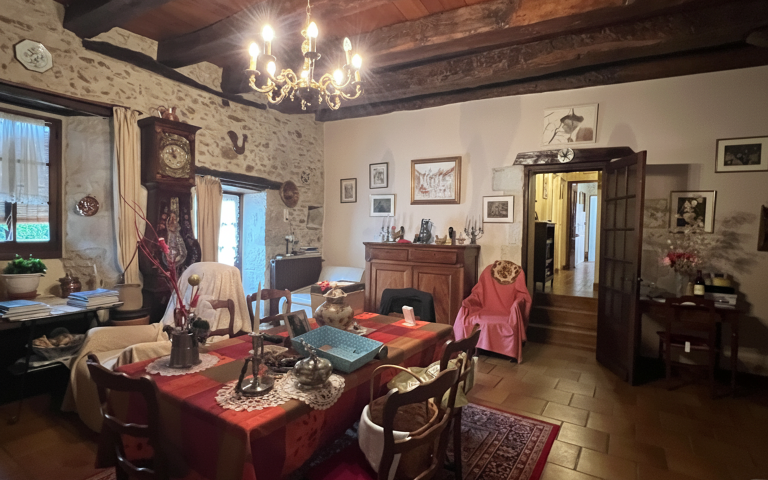 Séjour(s) de 38 m² avec pierres, poutres apparentes et cheminée.