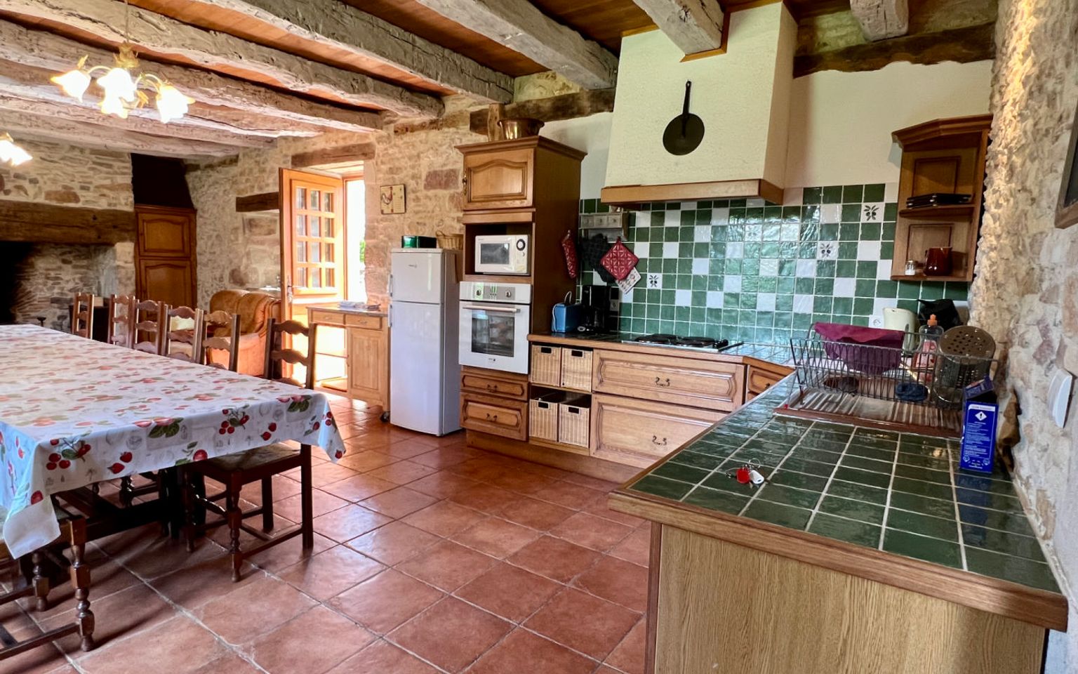 Cuisine(s) ouverte sur séjour de 44 m² avec cheminée foyer ouvert.