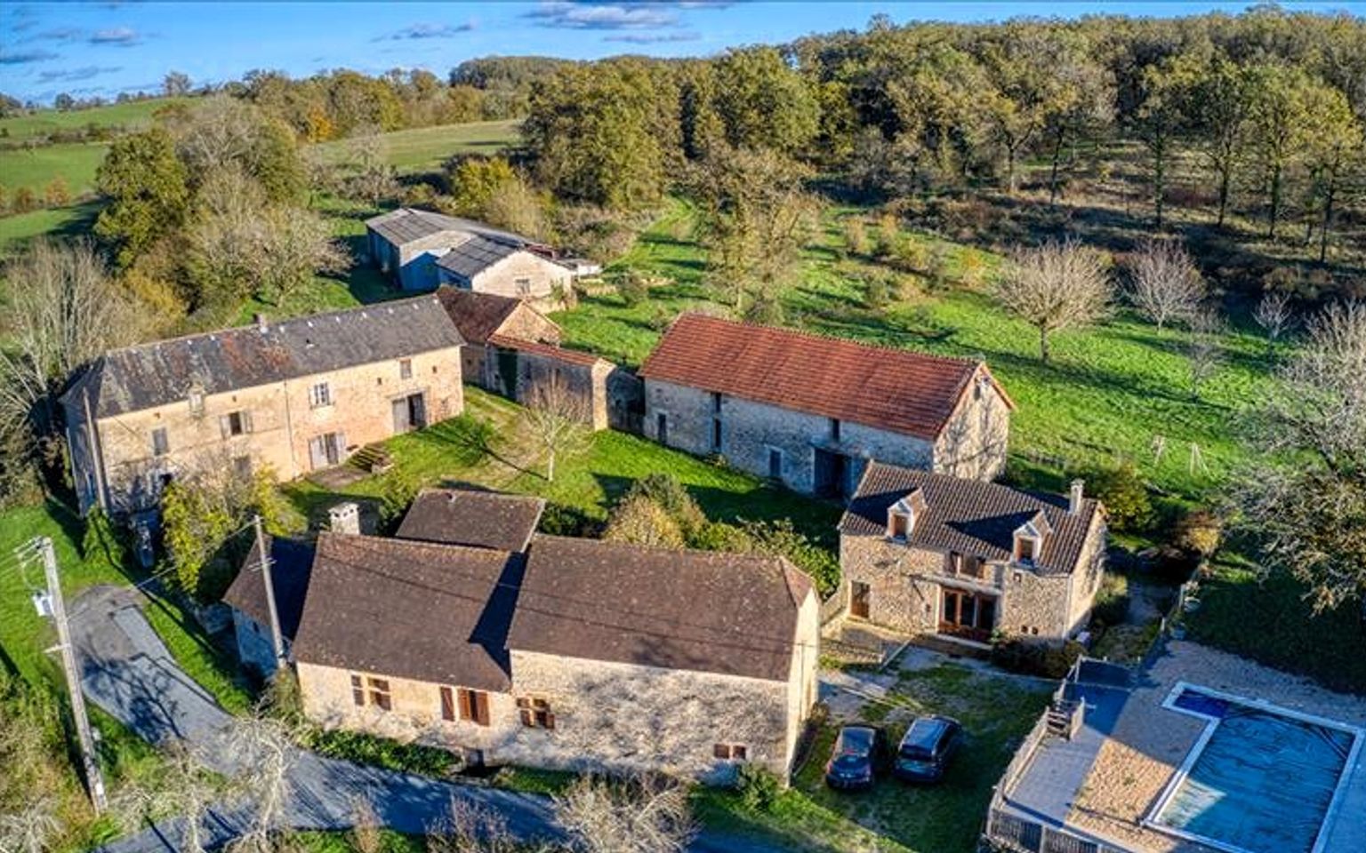 En Périgord Noir entre Montignac-Lascaux et Hautefort: ensemble comprenant deux gîtes de caractère et un corps de ferme à rénover sur environ 14 hectares de terrain.