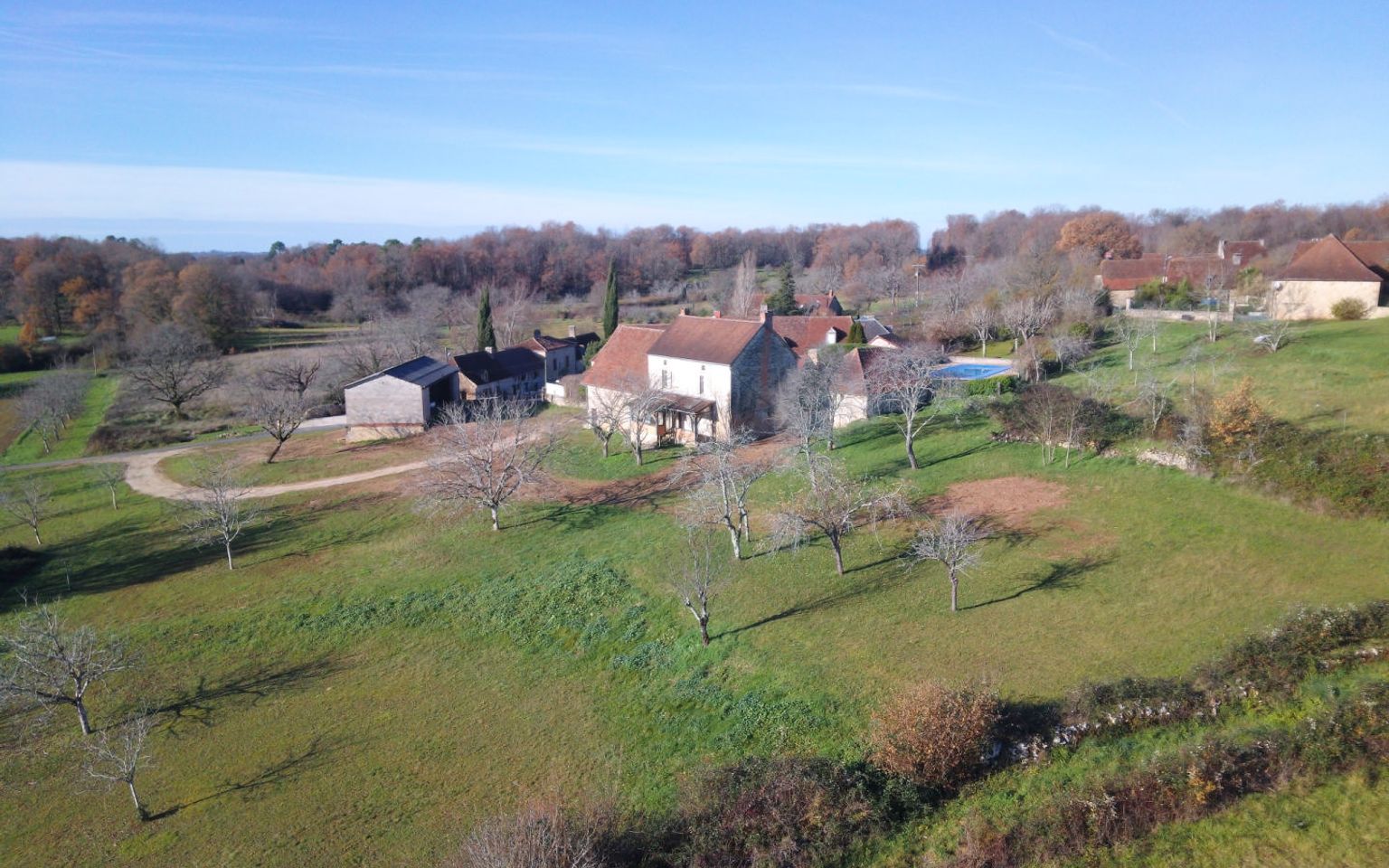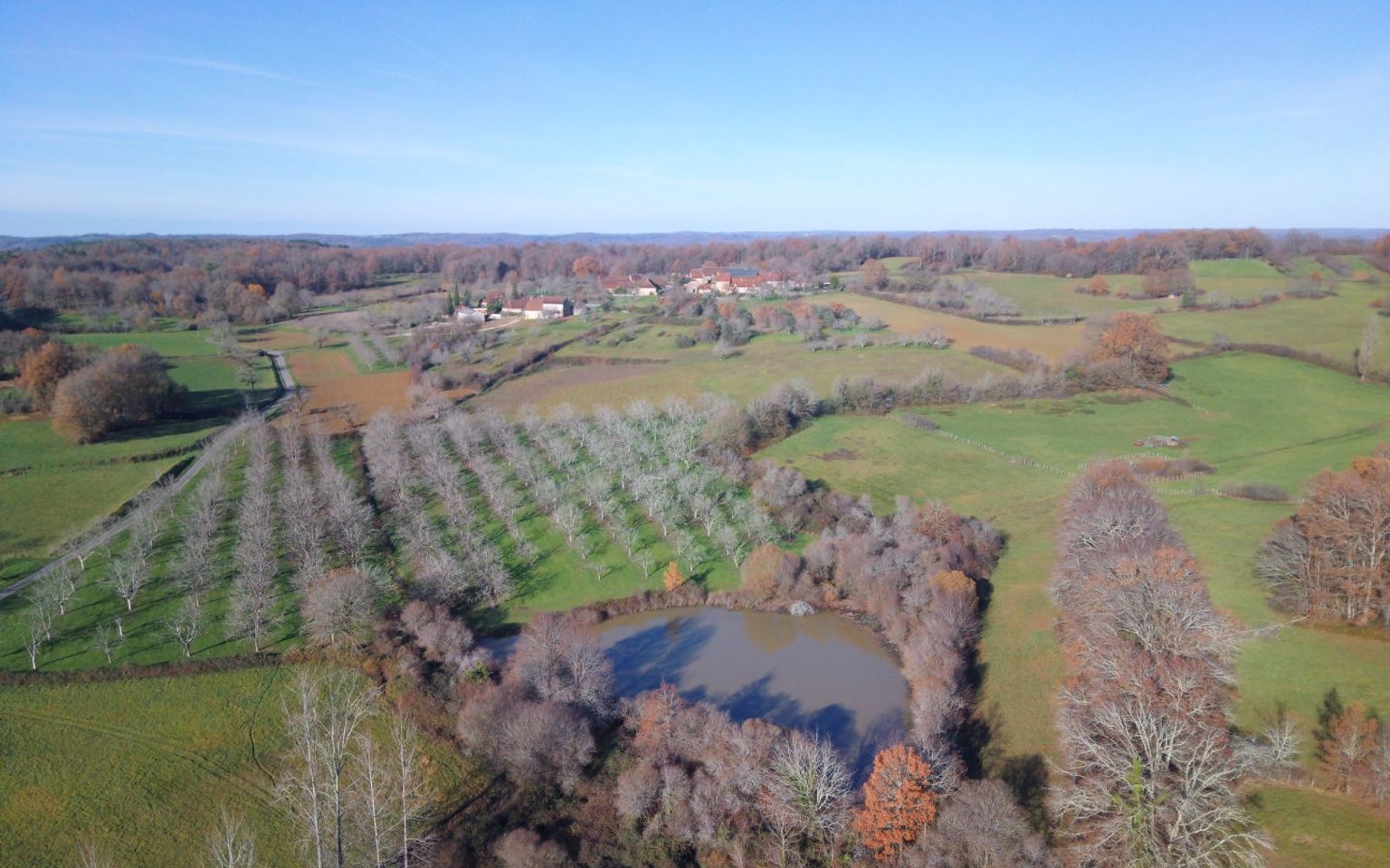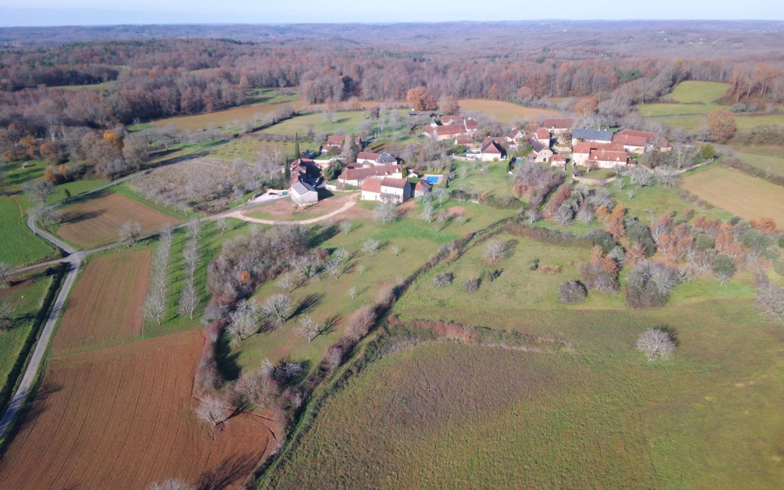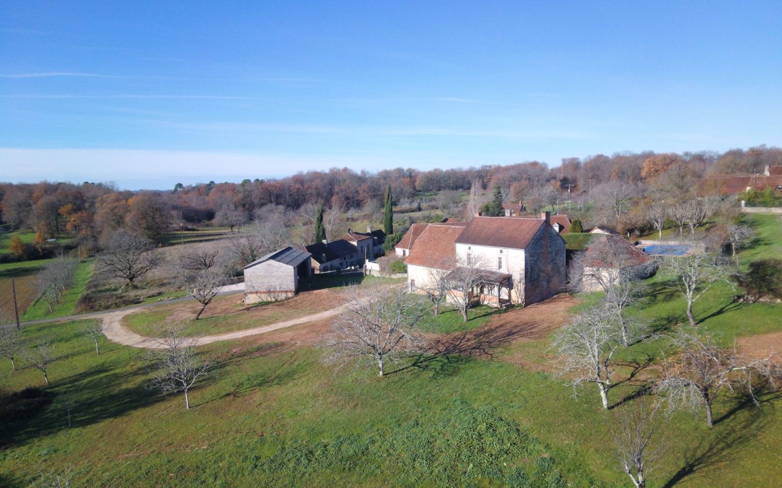 En Périgord Noir, sur les hauteurs, Propriété à rénover sur environ 4 hectares de terrain avec étang. Toitures neuves. Rénovation intérieure à réaliser.
