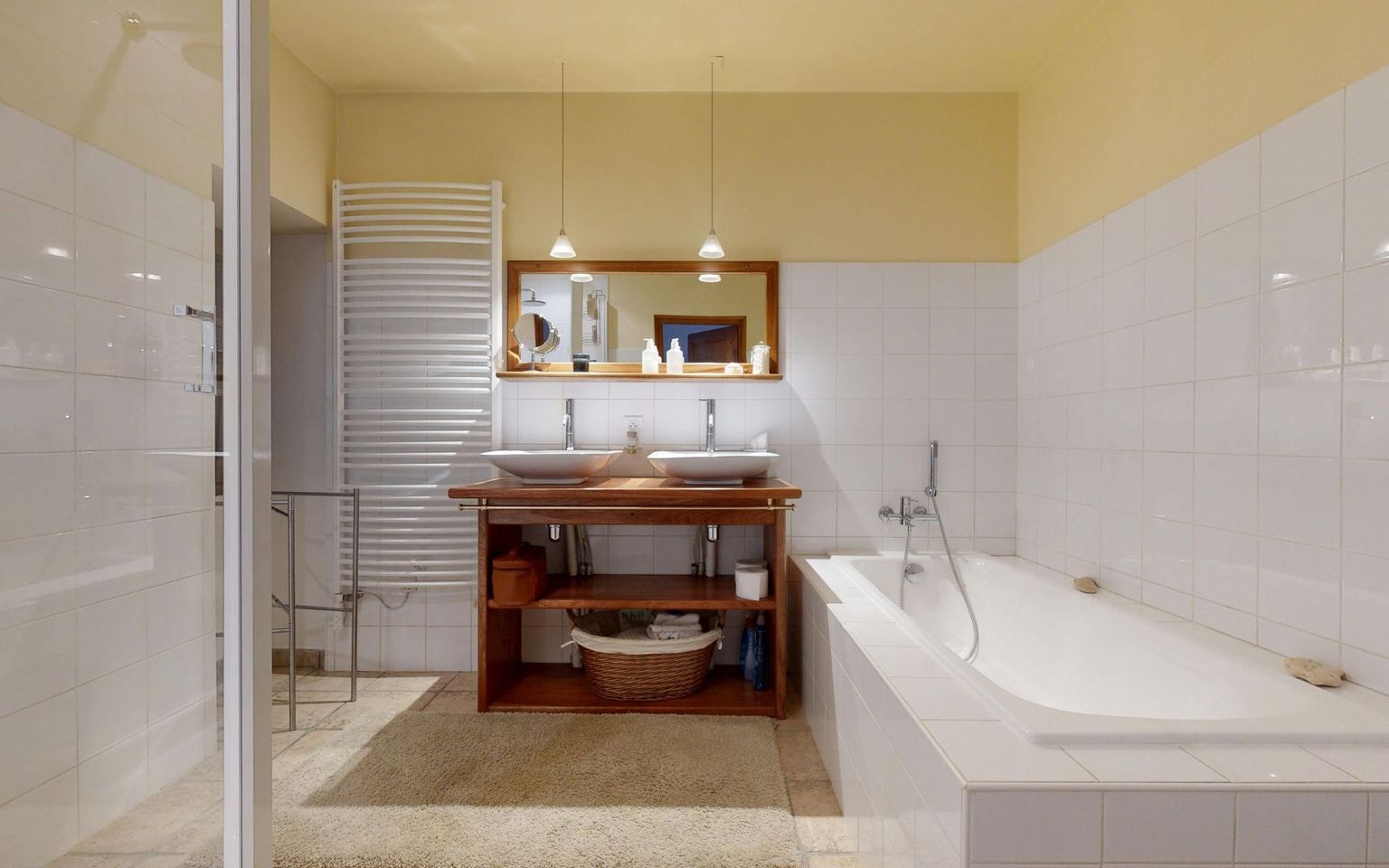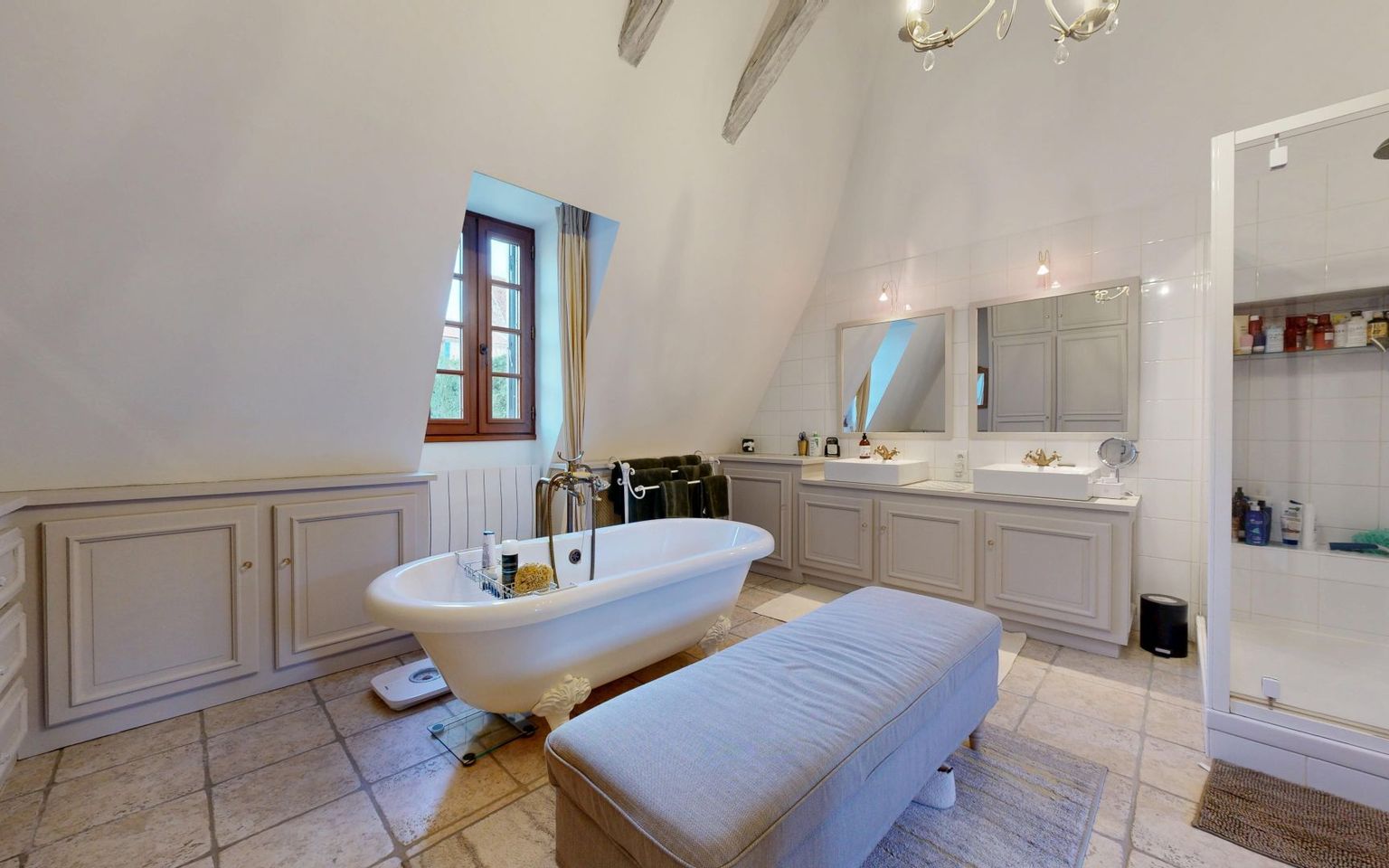 Salle(s) de bains 16 m2 en suite de la chambre avec grands placards, 2 vasques sur meuble, douche et baignoire.