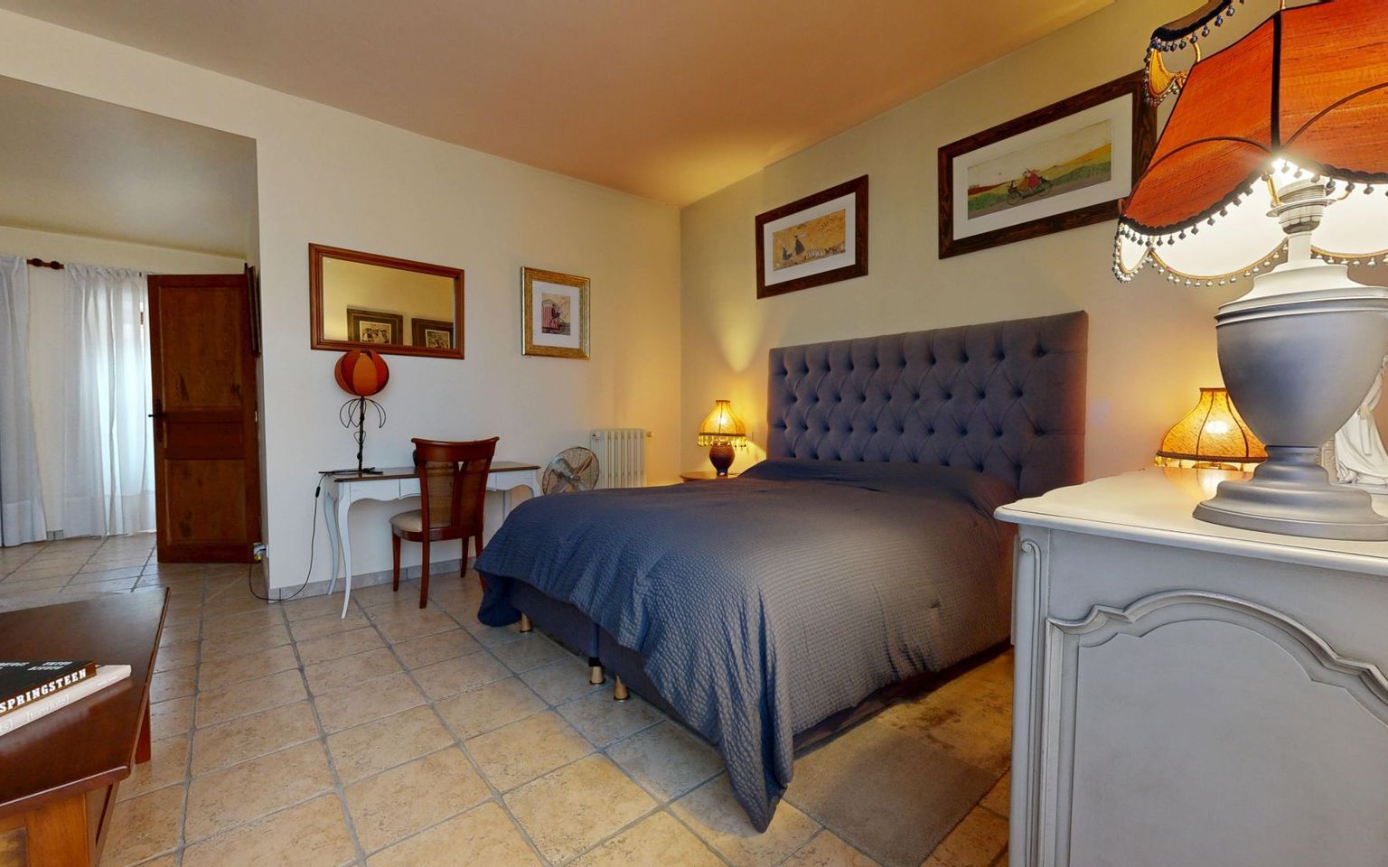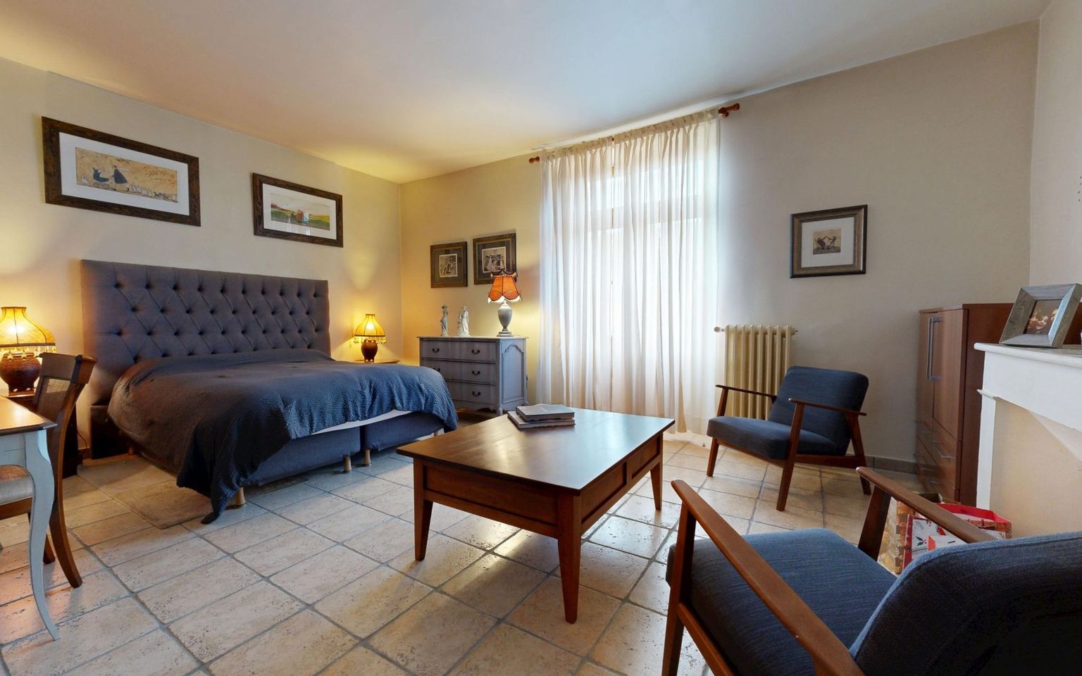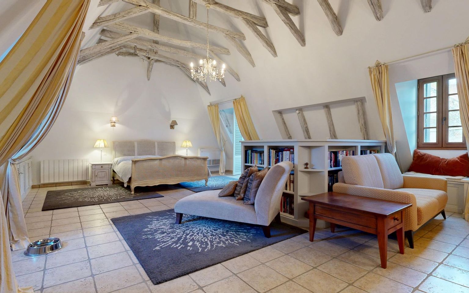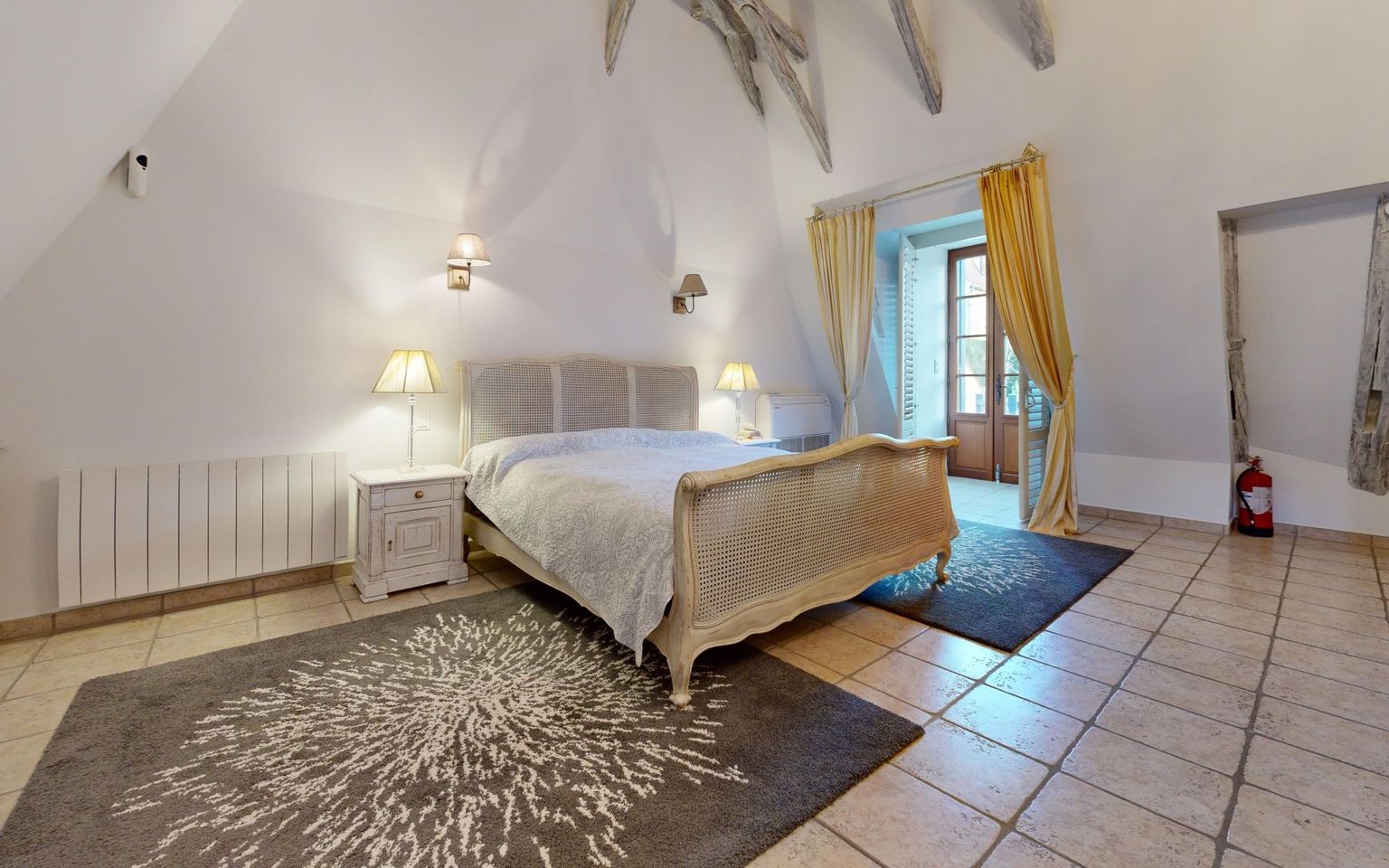Chambre(s) 45 m2 Chambre de maître vaste volume charpente cathédrale aux poutres apparentes, larges rangements, placards, poele, Climatisation. Porte vers le jardin - salle de bains ensuite 16m2