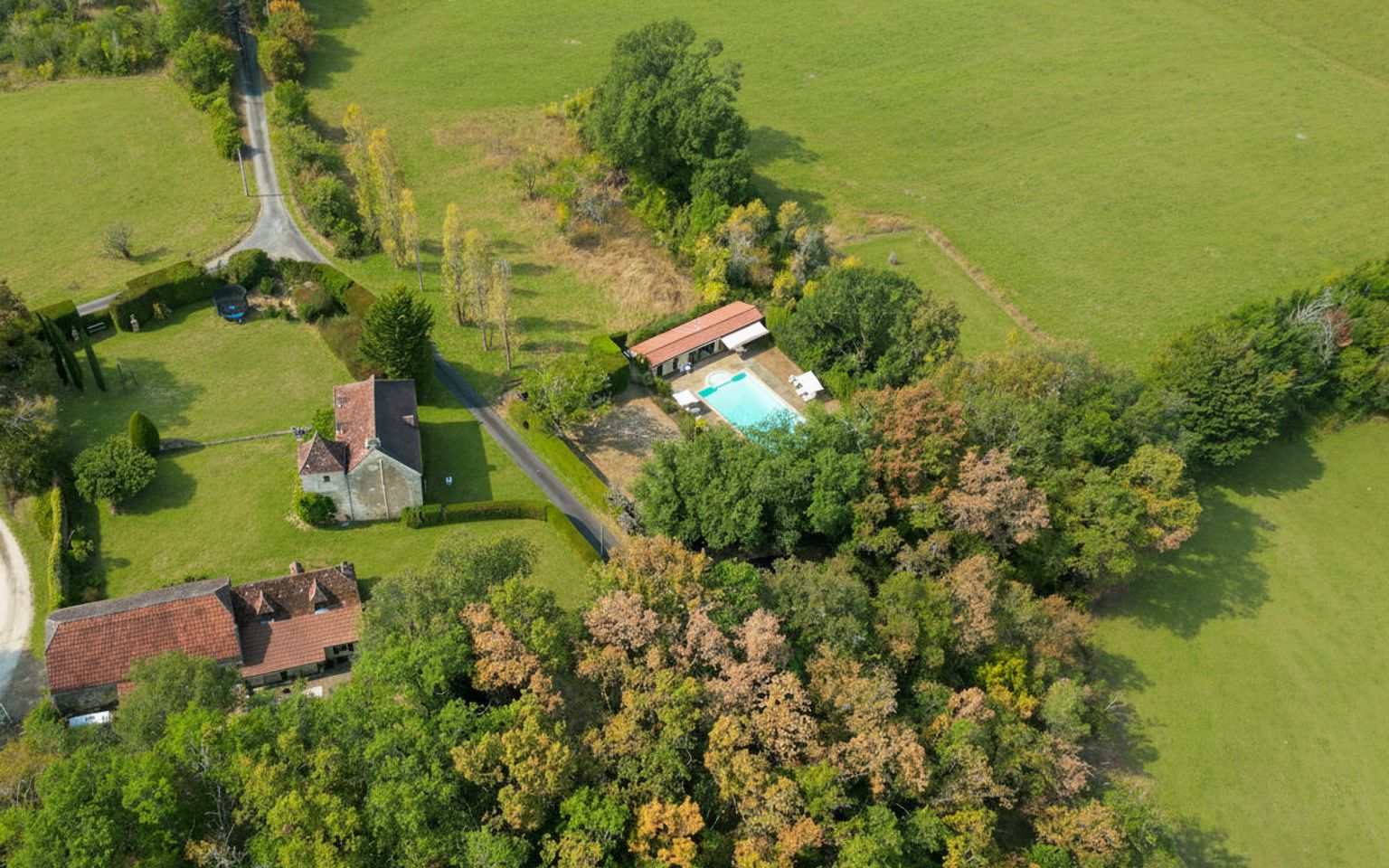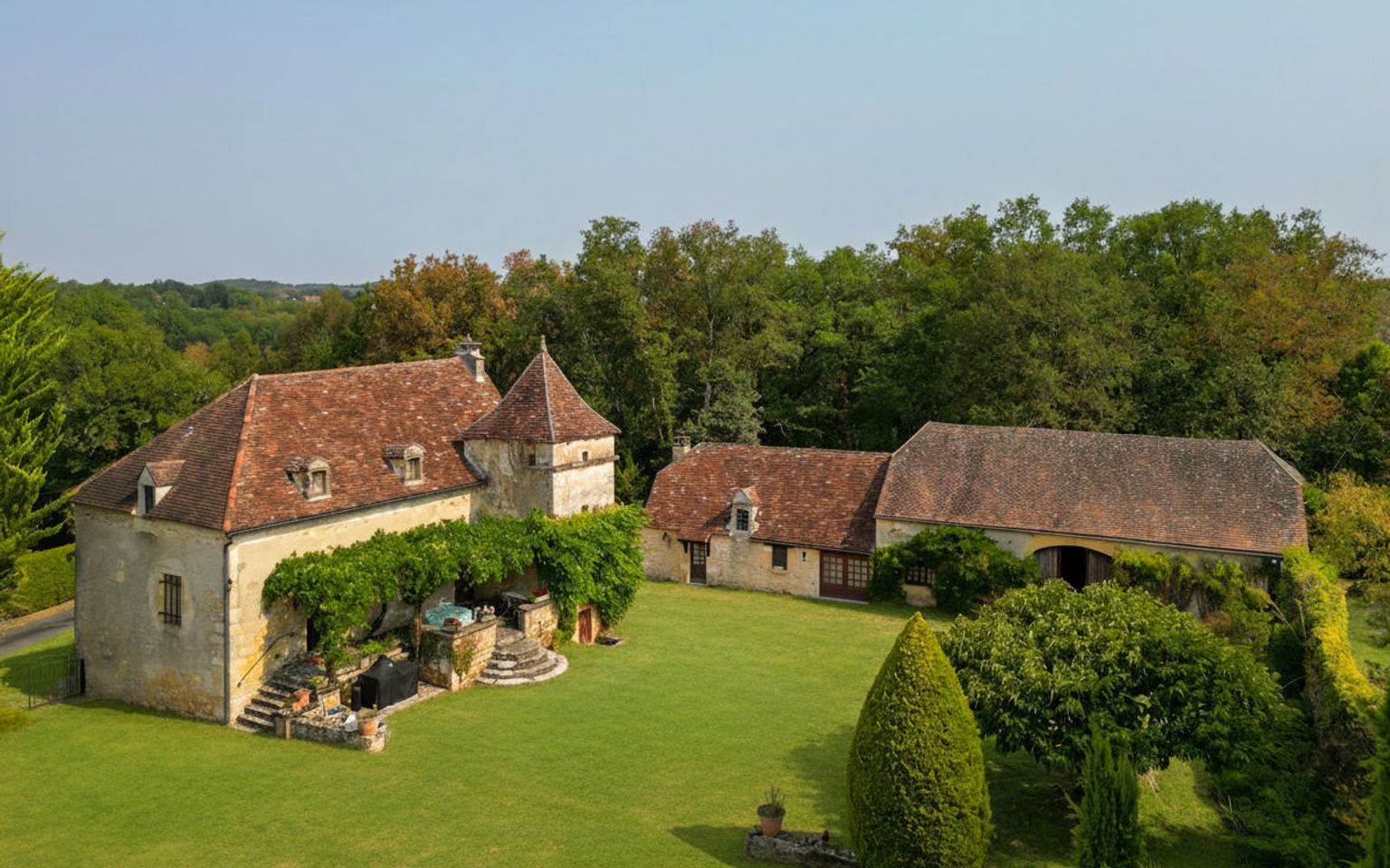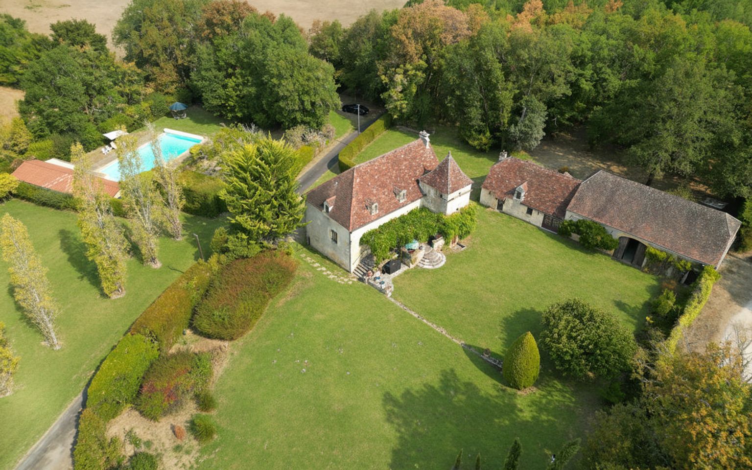 EXCLUSIVITE - Secteur Carlux - Coup de coeur pour cet Ensemble immobilier en pierre ! En situation indépendante au calme dans une belle campagne sur 3ha48 composés en majorité de prairies, cette magnifique Propriété de charme comprend une belle et typique Maison d'habitation accompagnée d'une grange en pierre avec partie aménagée en maison d'amis. Adjacent, à l'abri des regards, un agréable espace piscine avec grand bassin, plages, pool house, cuisine d'été. La Maison. RDC. Entrée par terrasse couverte bolet, Séjour de 40 m² avec cheminée - poêle Godin, salle à manger cuisine de 26,2 m², bureau de 3,5 m², wc avec lave-mains de 1,6 m². Etage. Palier de 7 m², 2 chambres de 19 m², 1 salle de bains wc de 6 m² et 1 salle de bains avec douche et bains wc de 8,4 m². RDJ. Atelier + cave de 30 m², 3 parties caves de 5,3 m² et 9 m² + 15 m². Chauffage au gaz (Chaudière Viessmann) et bois (poêle Godin). Fosse septique récente. La Grange. avec espace buanderie de 75 m² au sol. La Dépendance aménagée attenante à la partie grange. comprenant en RDC : séjour de 20 m², cuisine de 5,6 m², 2 chambres de 17,8 m² et 19,6 m², salle de bains wc de 7,7 m², salle d'eau wc de 6,6 m². Etage : chambre de 17 m² pouvant être divisée en deux. Abri de jardin en pierre à l'arrière de la grange. Piscine de 14 x 6 au sel chauffée. Pool house et Local technique piscine avec salle d'eau wc de 4,3 m² et dégagement de 4 m². Cuisine d'été près de la piscine avec espace repas de 21 m². Les informations sur les risques auxquels ce bien est exposé sont disponibles sur le site Géorisques: www.georisques.gouv.fr