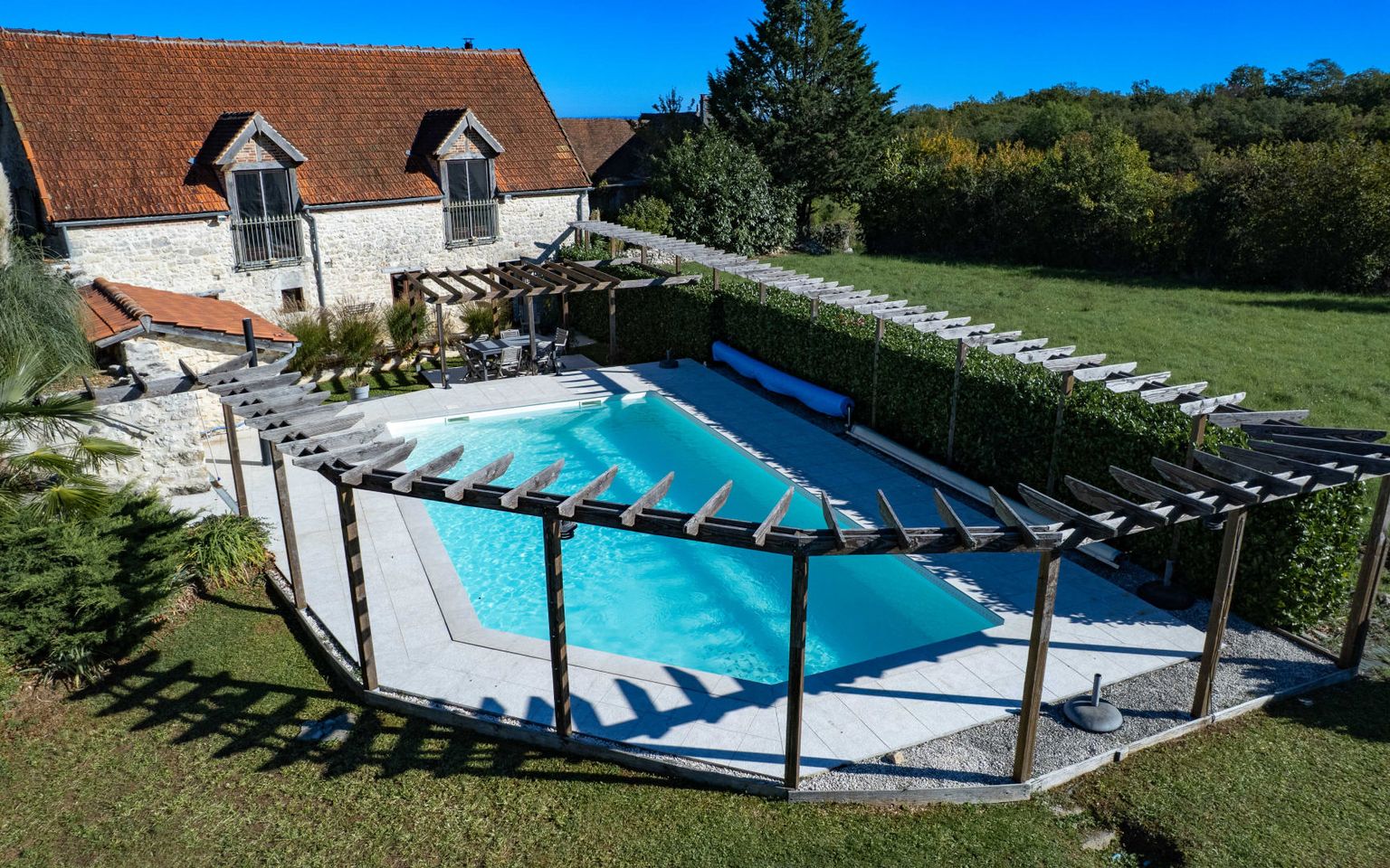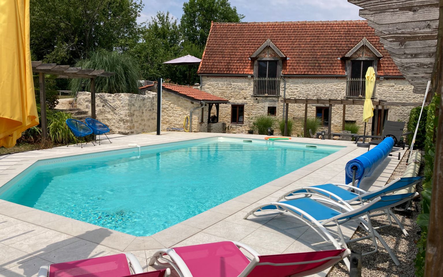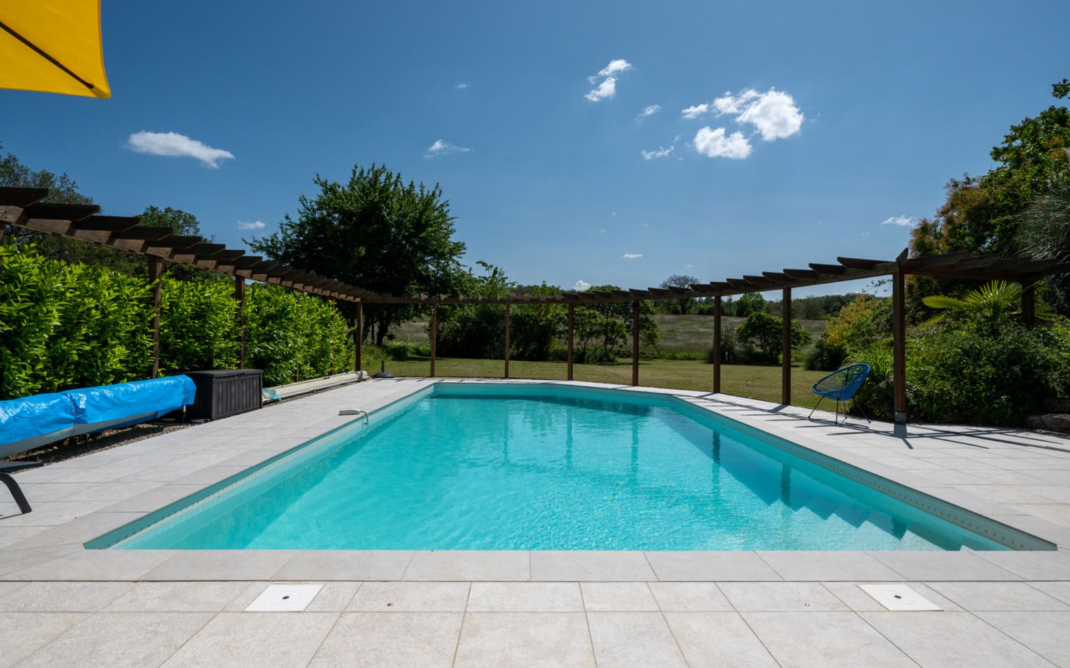 Piscine au chlore chauffée avec plages. Local technique, espace cuisine d'été.