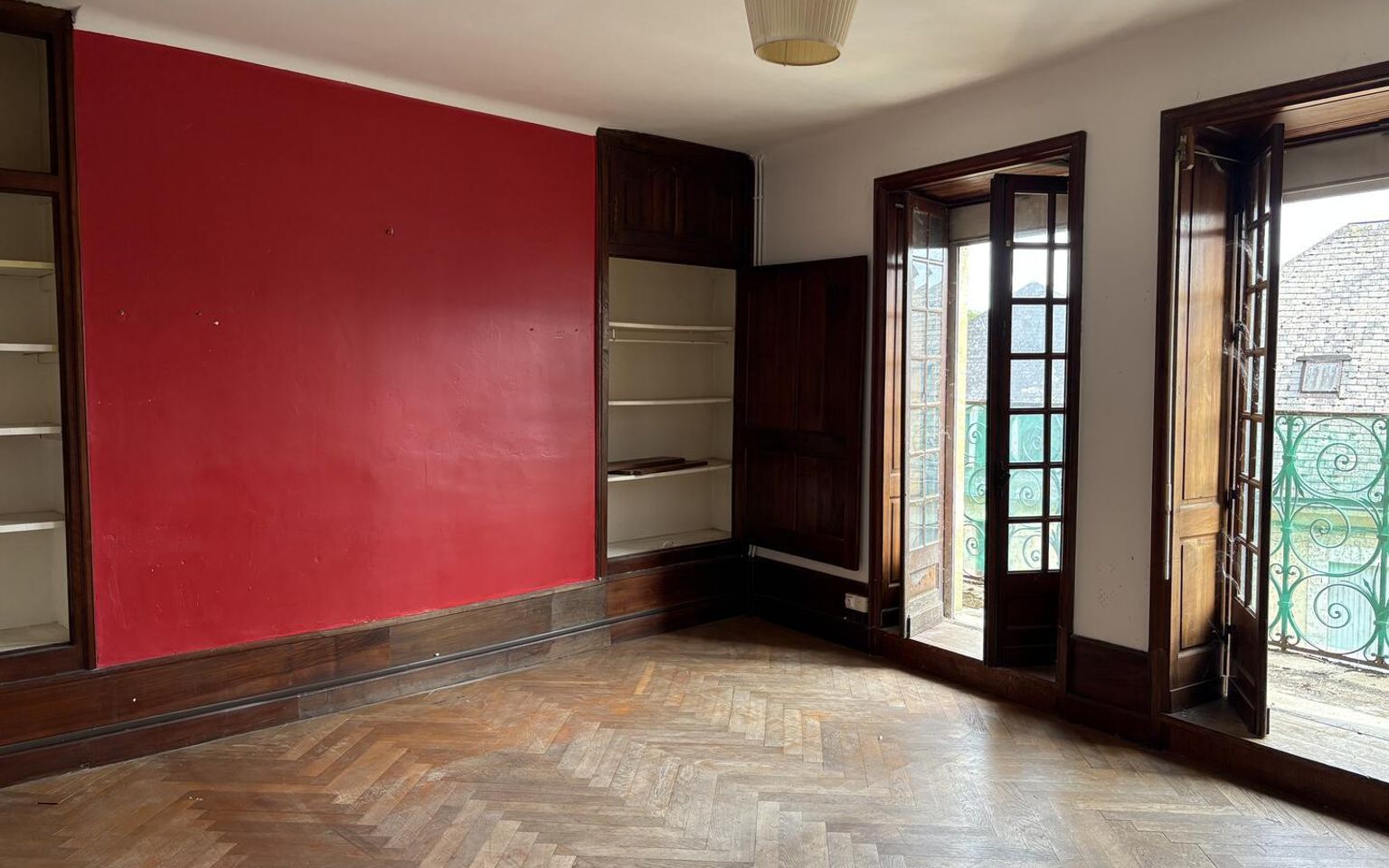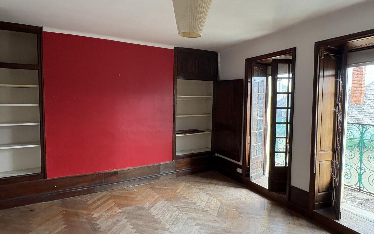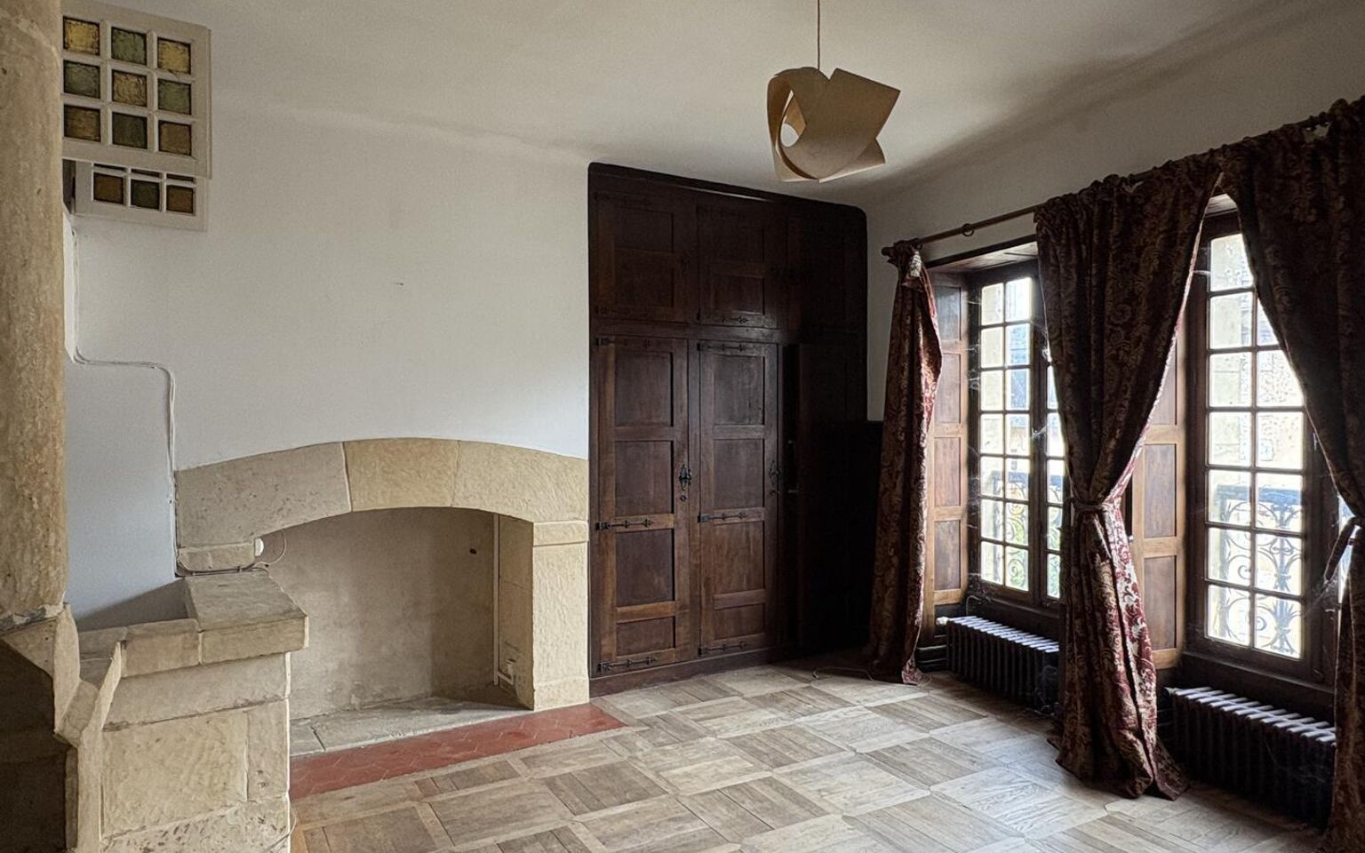 Salon(s) d'environ 15 m² avec placards, parquet et cheminée.