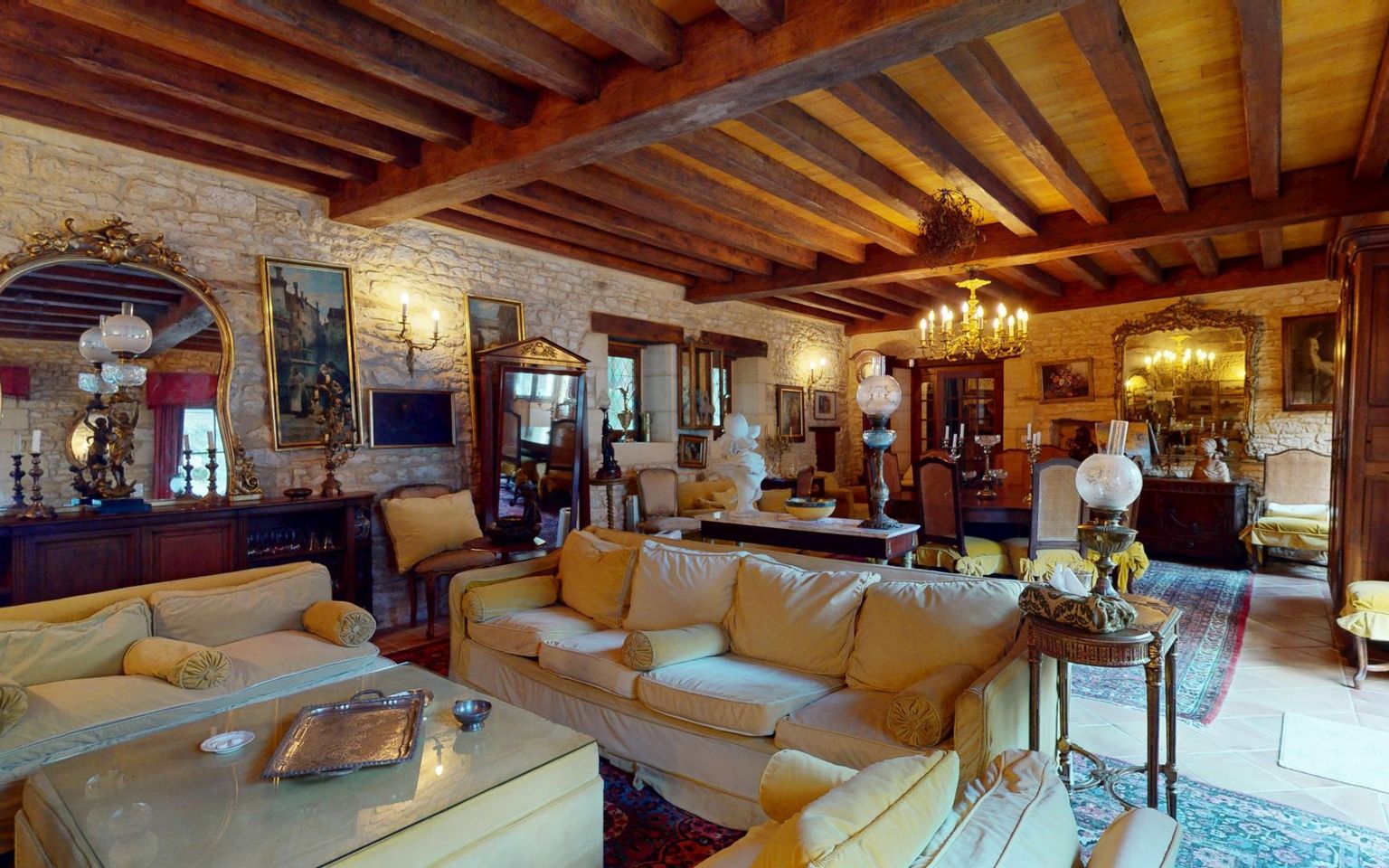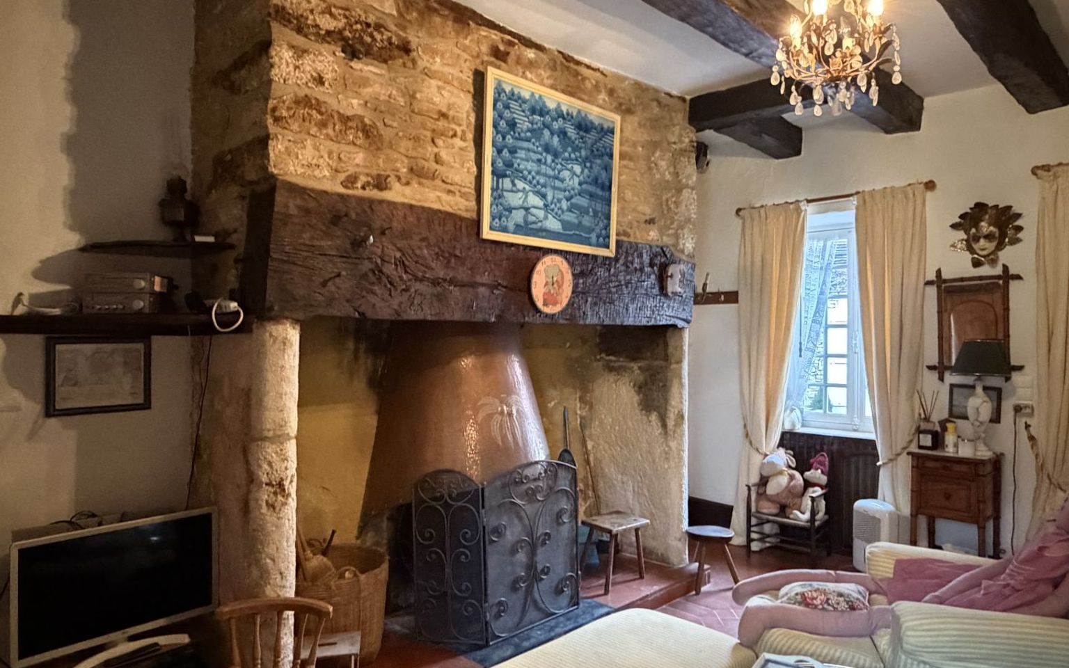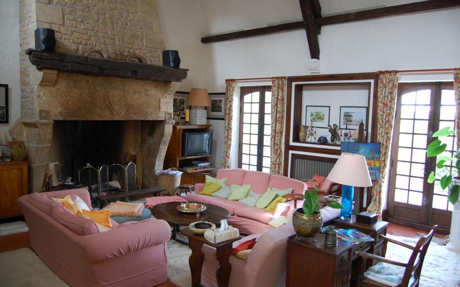 Salon(s) /salle à manger de 58 m², cheminée en pierre, portes-fenêtres donnant sur la cour.