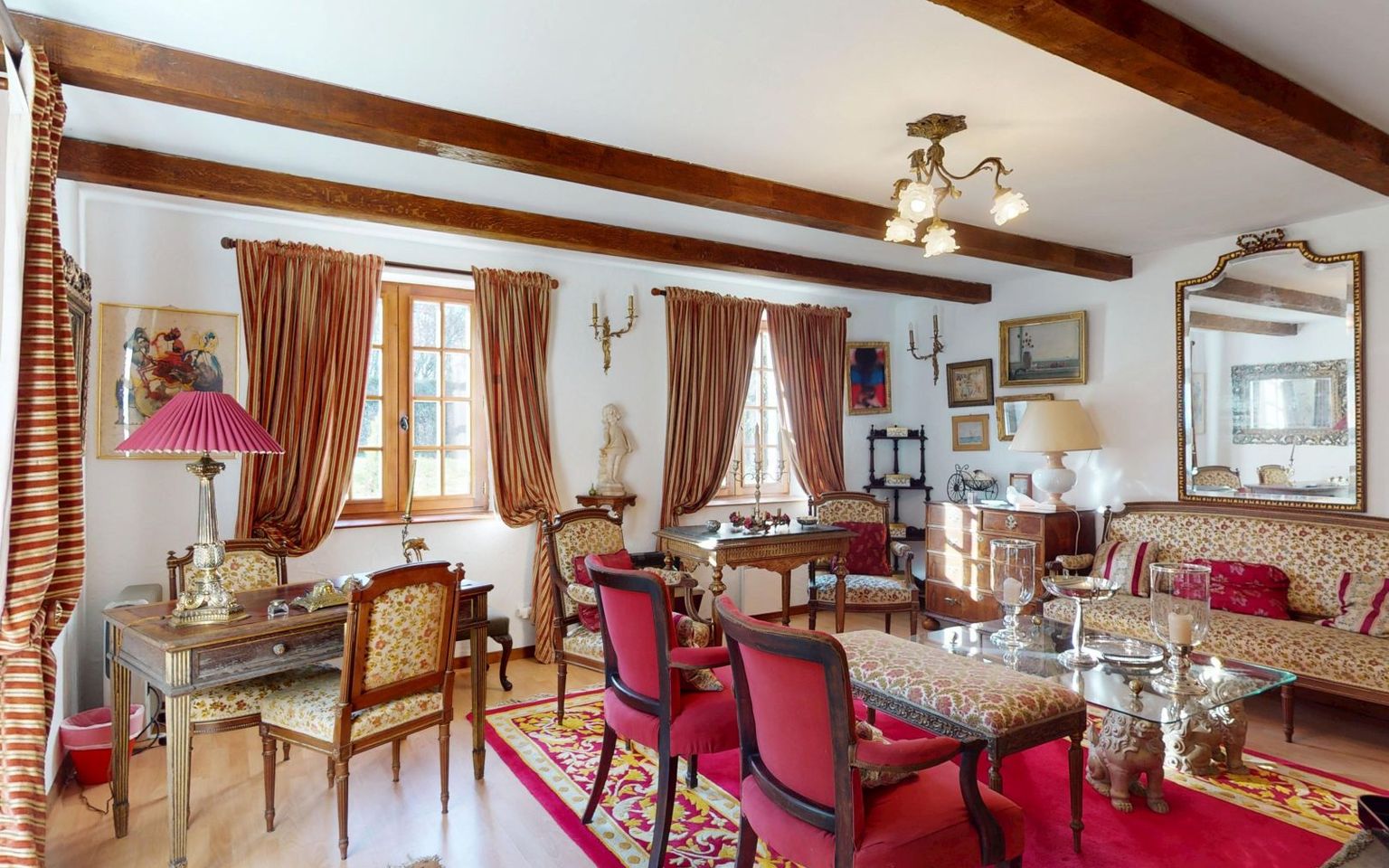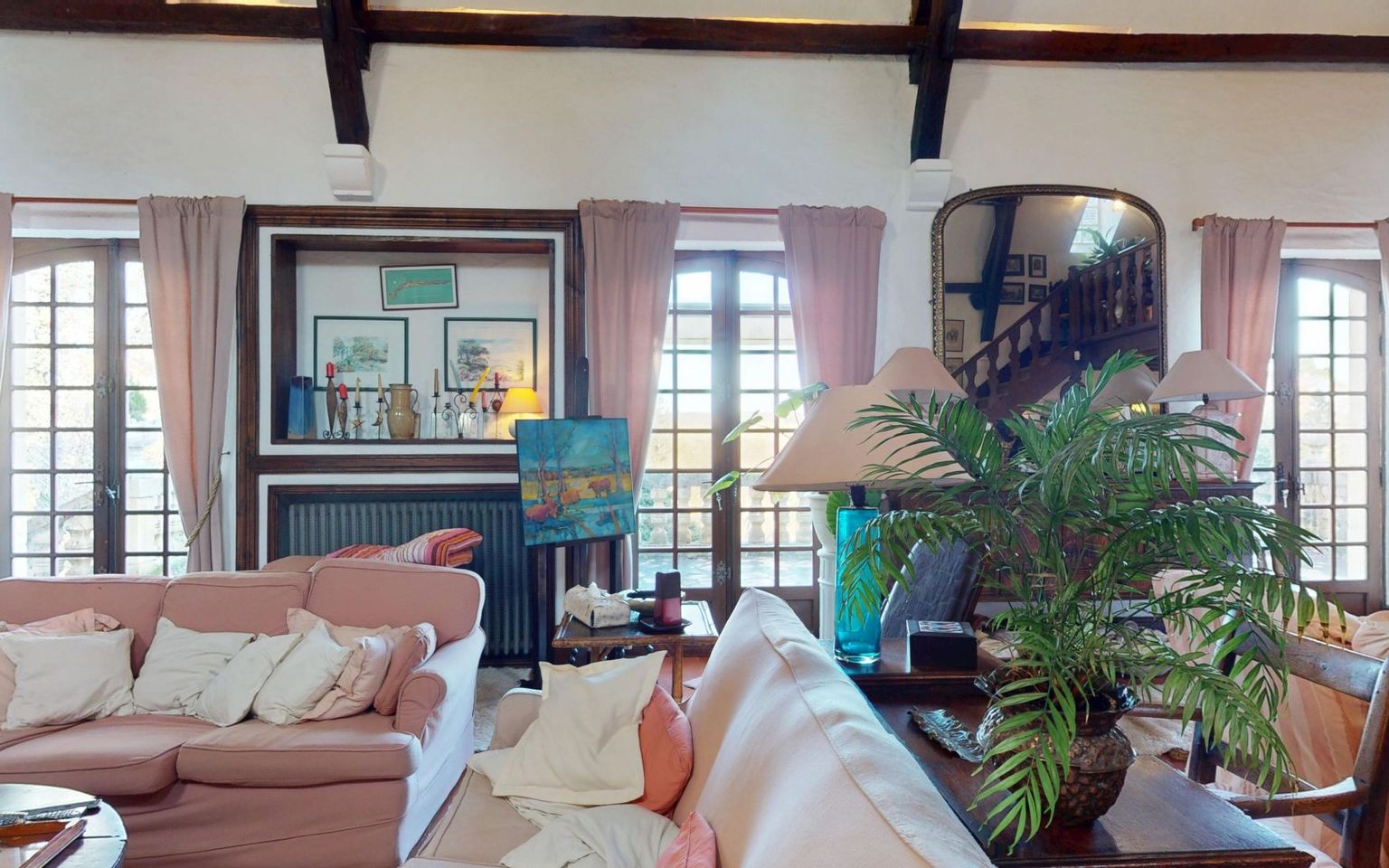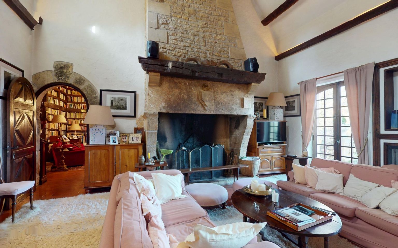 Salon(s) /salle à manger de 58 m², cheminée en pierre, portes-fenêtres donnant sur la cour.