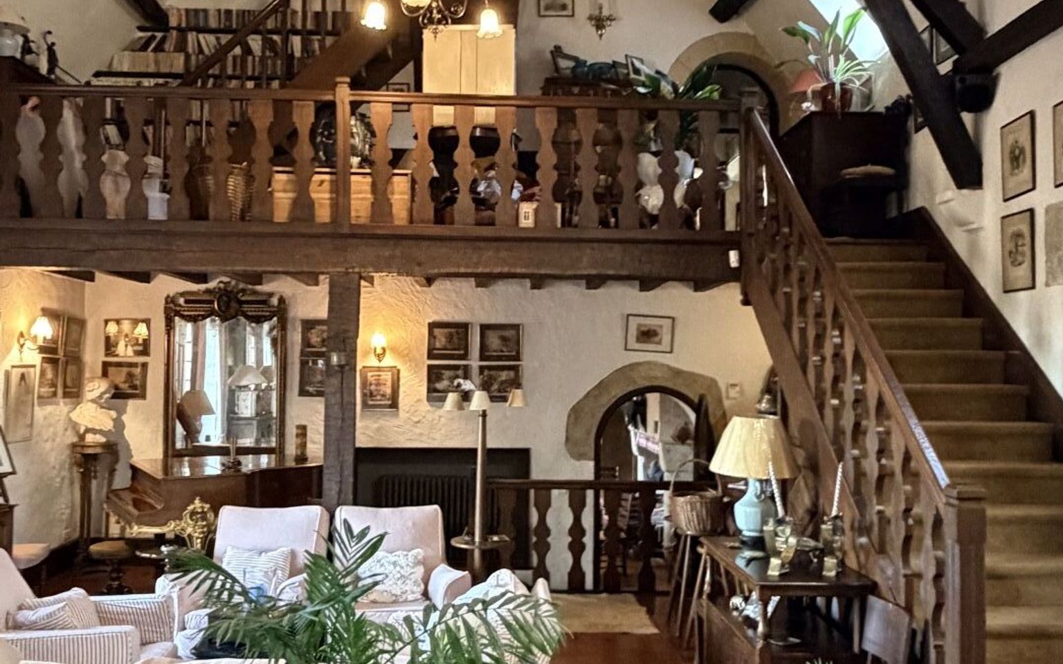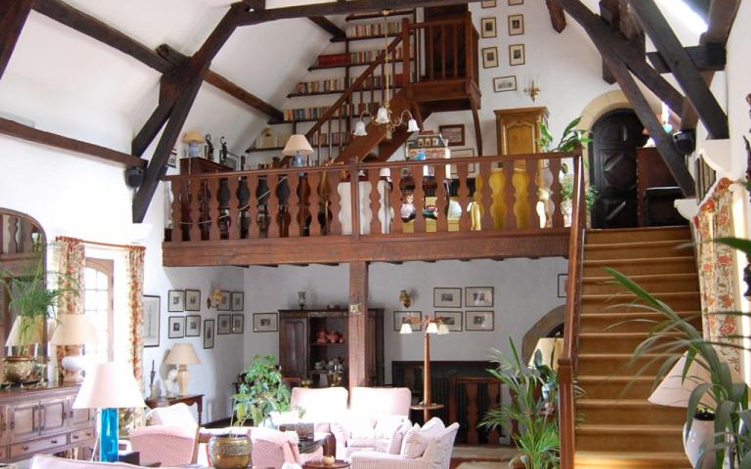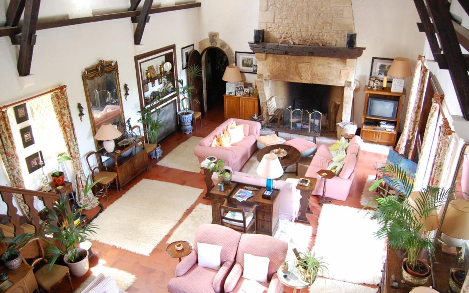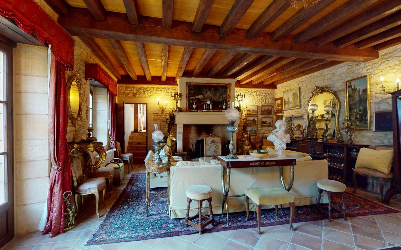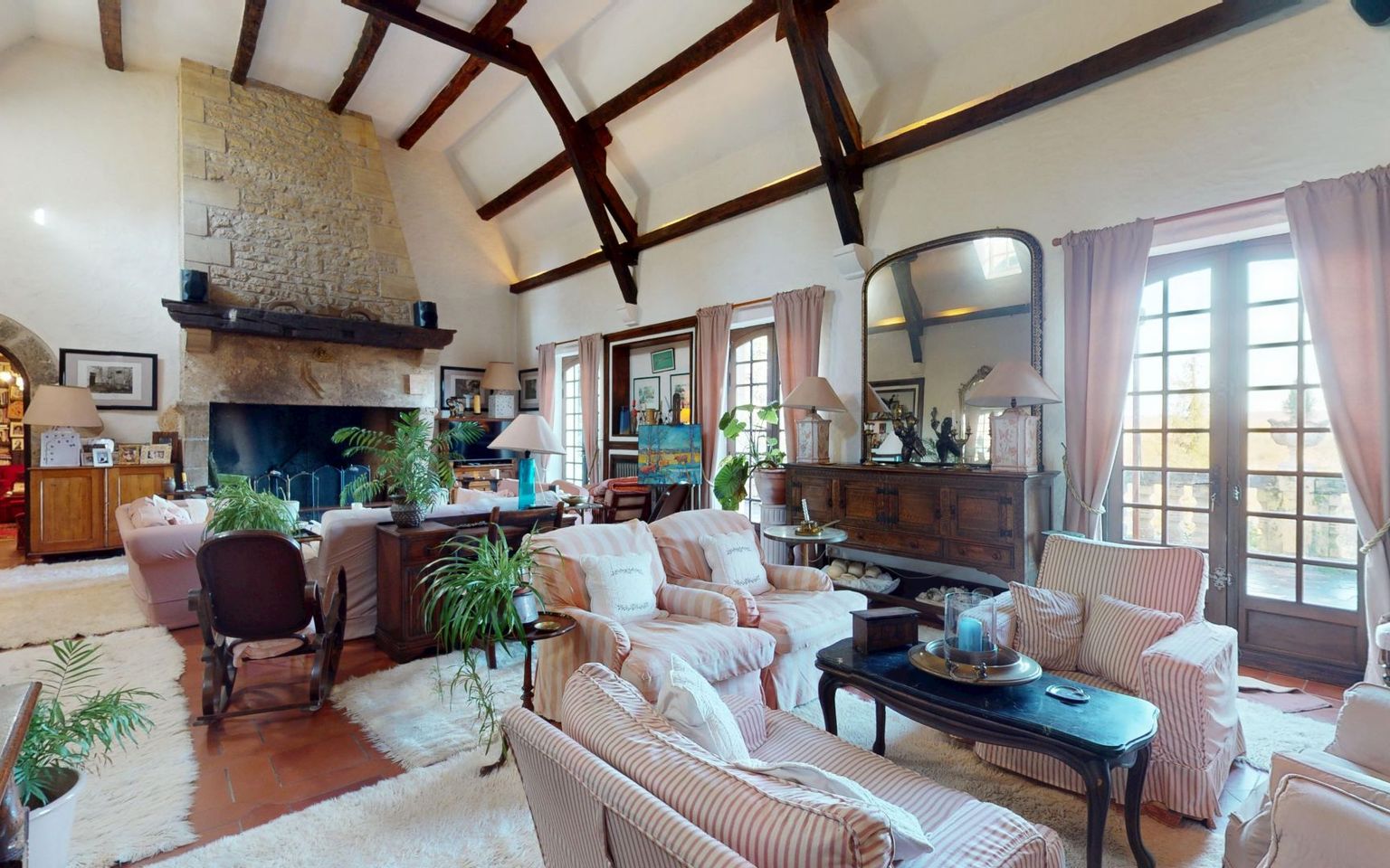 Séjour(s) /salon d'environ 80 m² avec cheminée monumentale. Pierres et poutres apparentes. Carrelage.