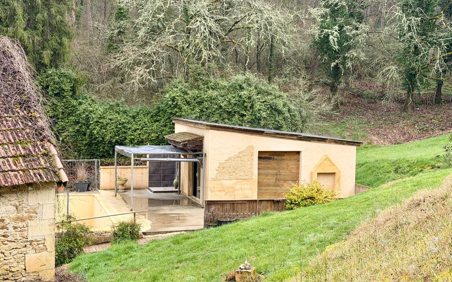 Elle se compose de quatre chambres et de trois salles d'eau, implantées sur un terrain de six hectares comprenant une piscine ainsi qu'une source d'eau.