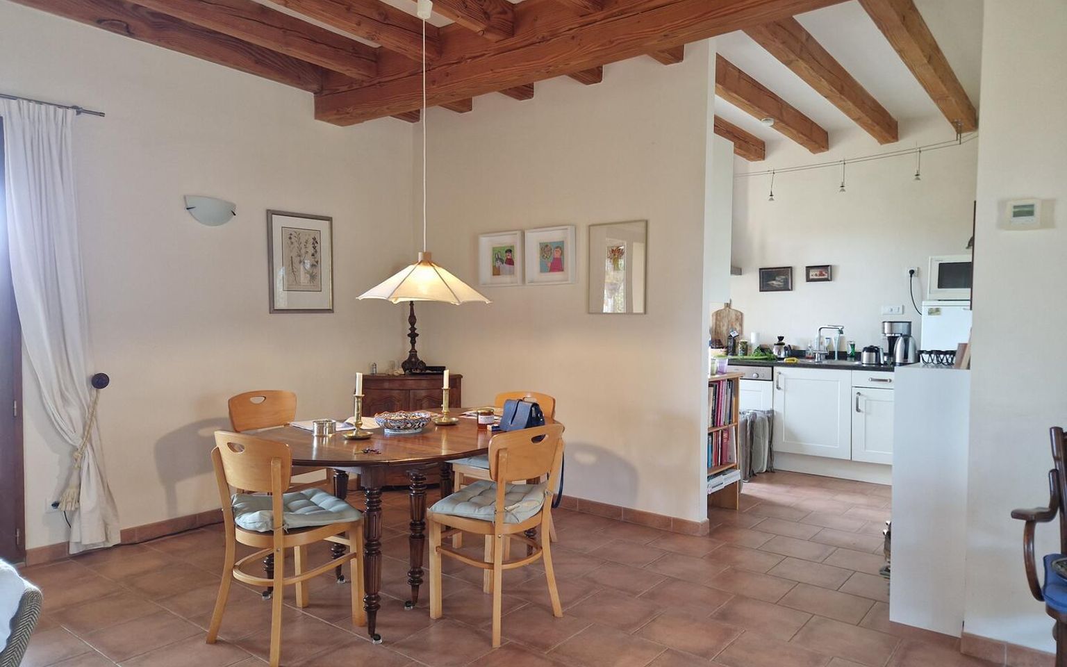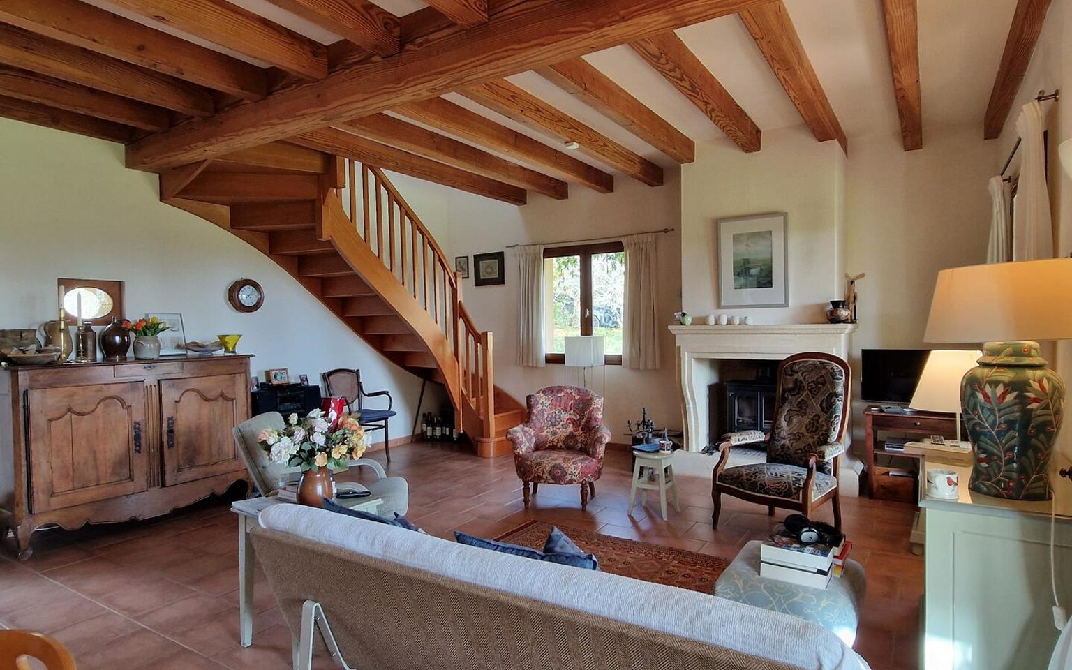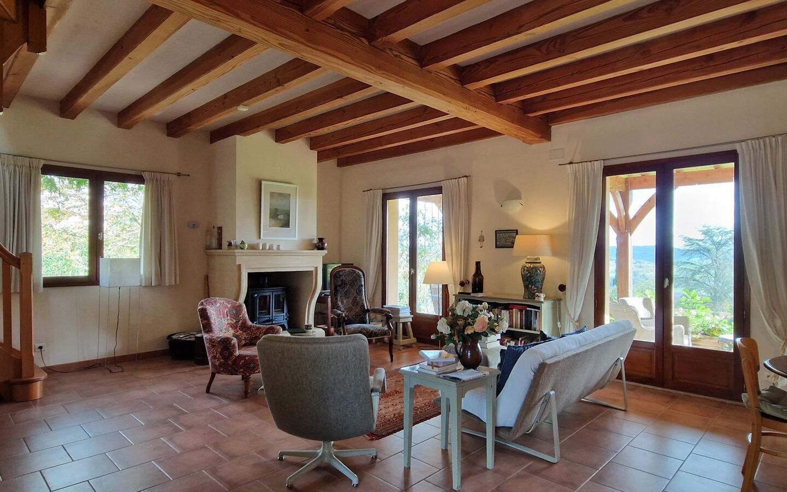 Pièce(s) à vivre 44m2 plafond poutres, Escalier bois vers étage, cheminée avec poêle, portes fenêtres vers terrasse couverte au Sud avec Vue sur la Vallée.