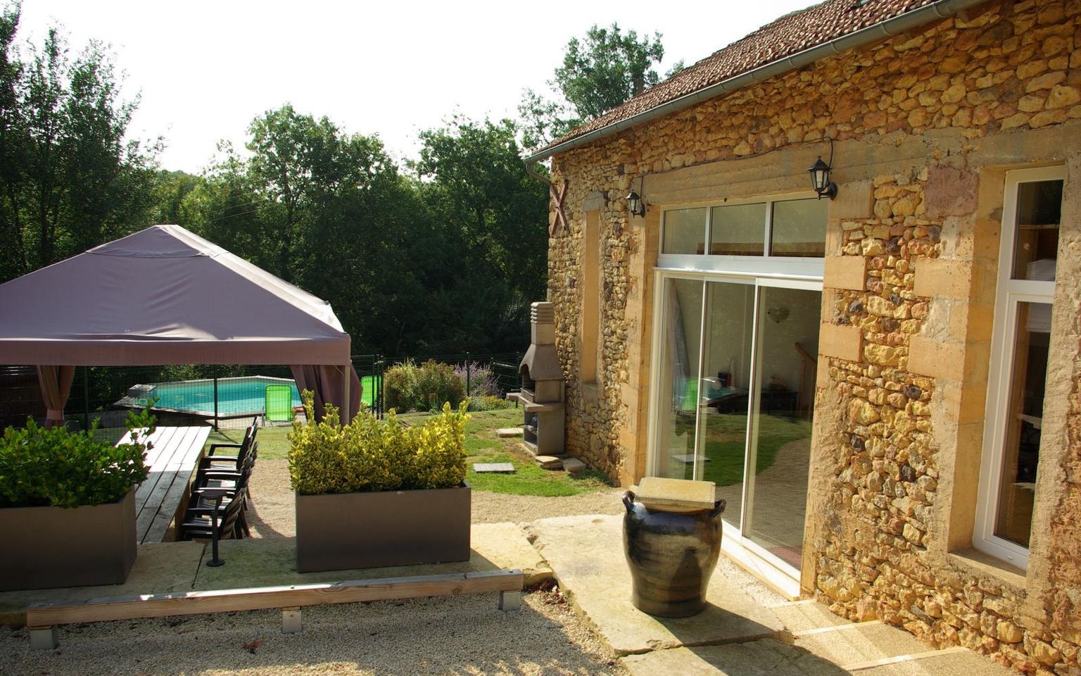 Une maison principale de 6 pièces, un gite de deux chambres, un grand gite de quatre chambres (10 couchages). Deux piscines. Le tout agrémenté d'une vue champêtre depuis les coteaux du Coux et Bigaroque. À 7 minutes de tous les commeces.