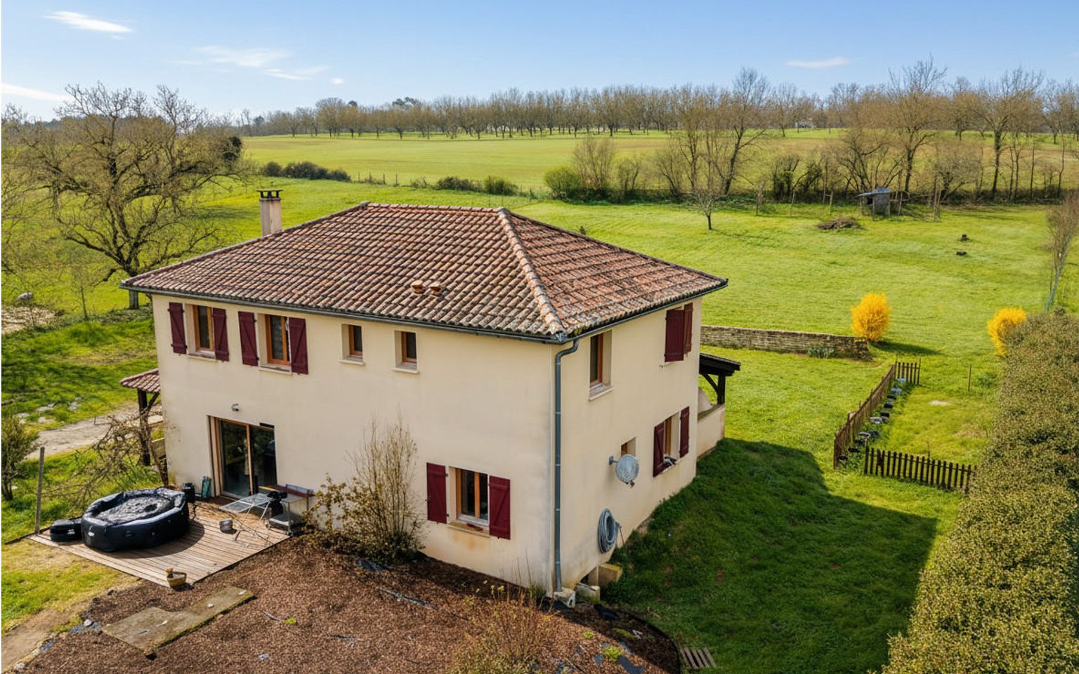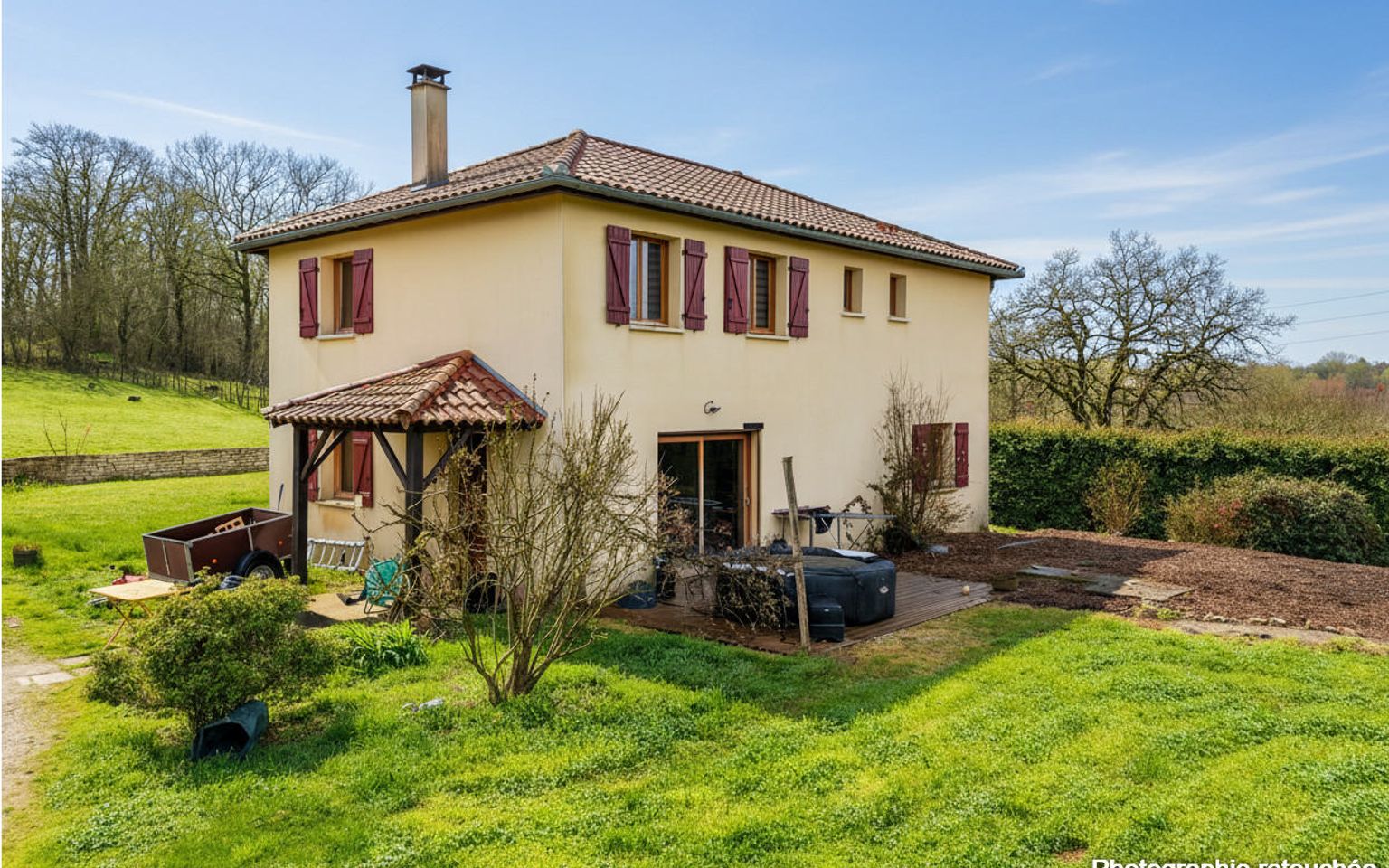 Chauffage électrique et bois (poêle Godin). Double vitrage, volets électrique et bois. Fosse septique.Abri de jardin.