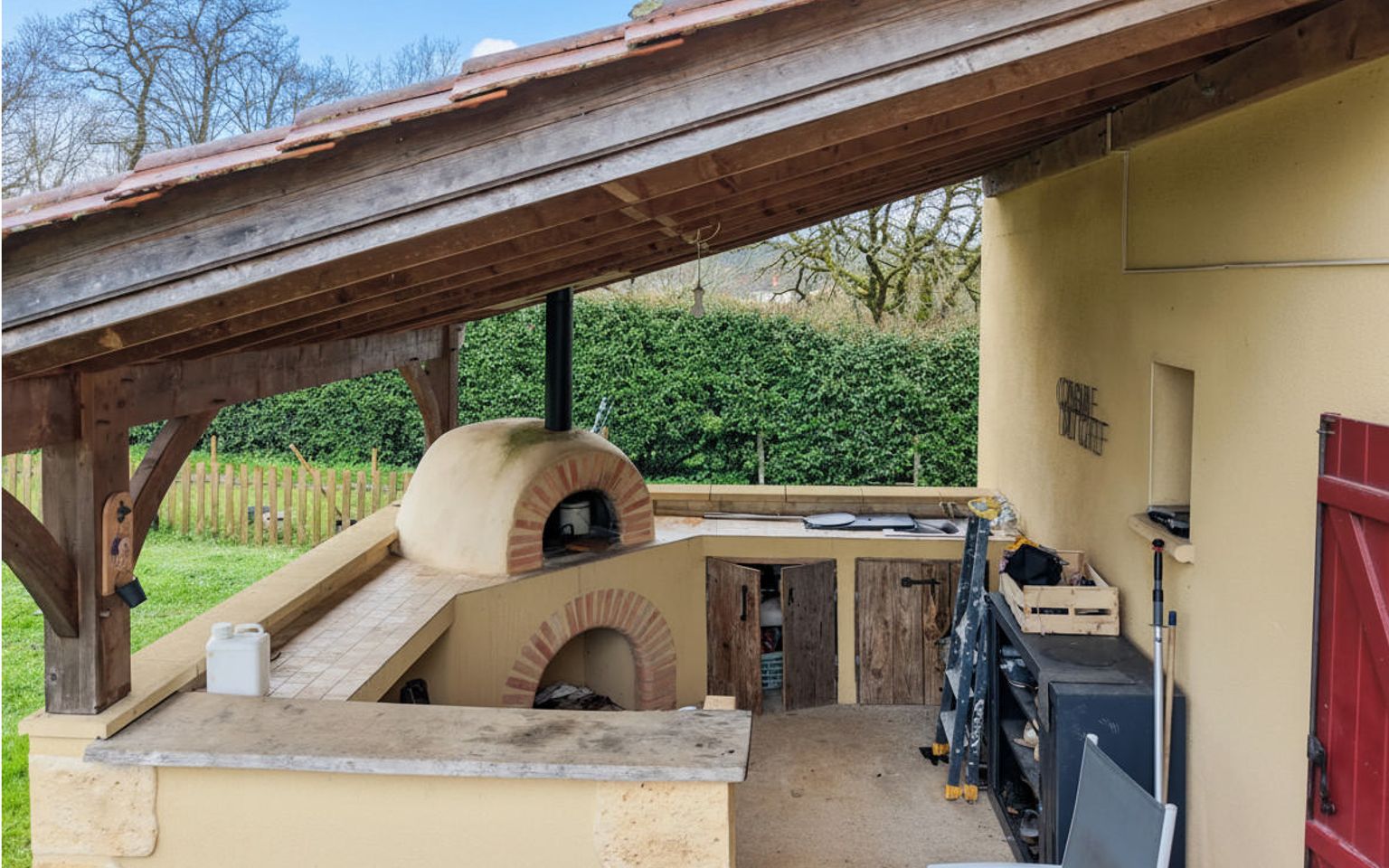 Terrasse couverte de 12 m² avec four à pizza.