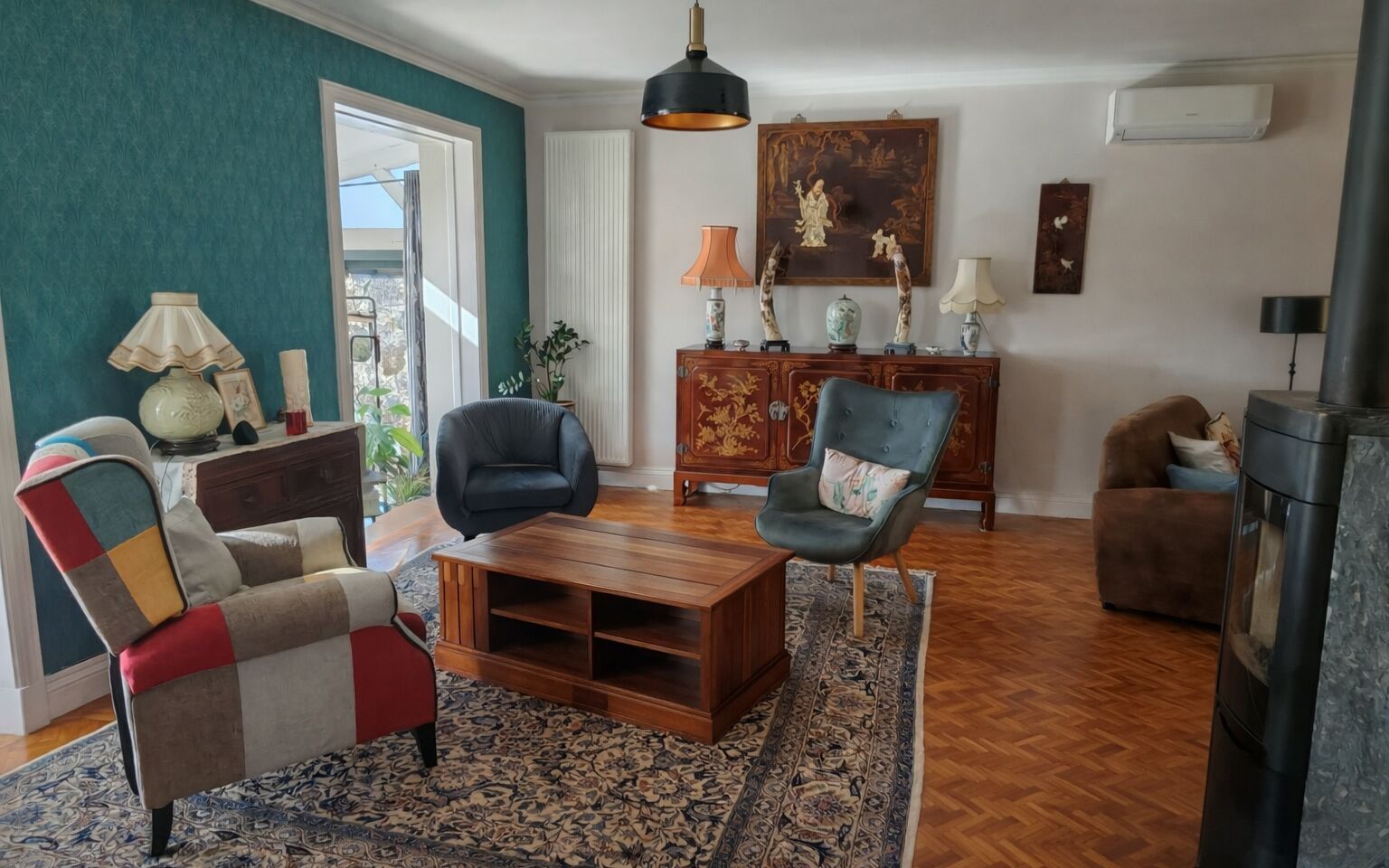 Gas central heating is complemented by a reversible air-to-air heat pump and a wood-burning stove.