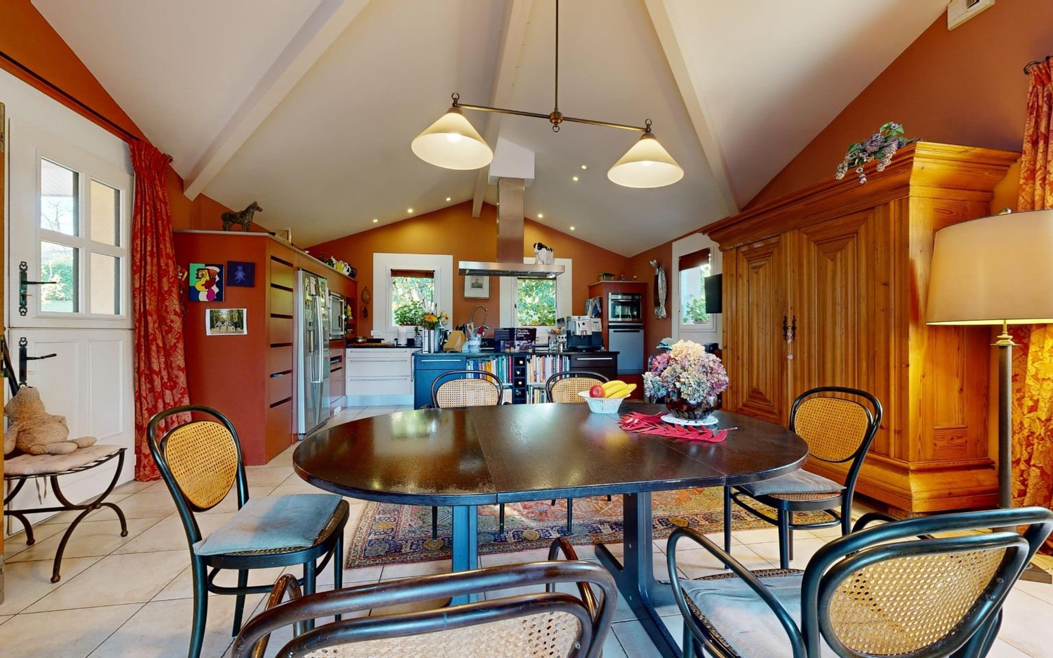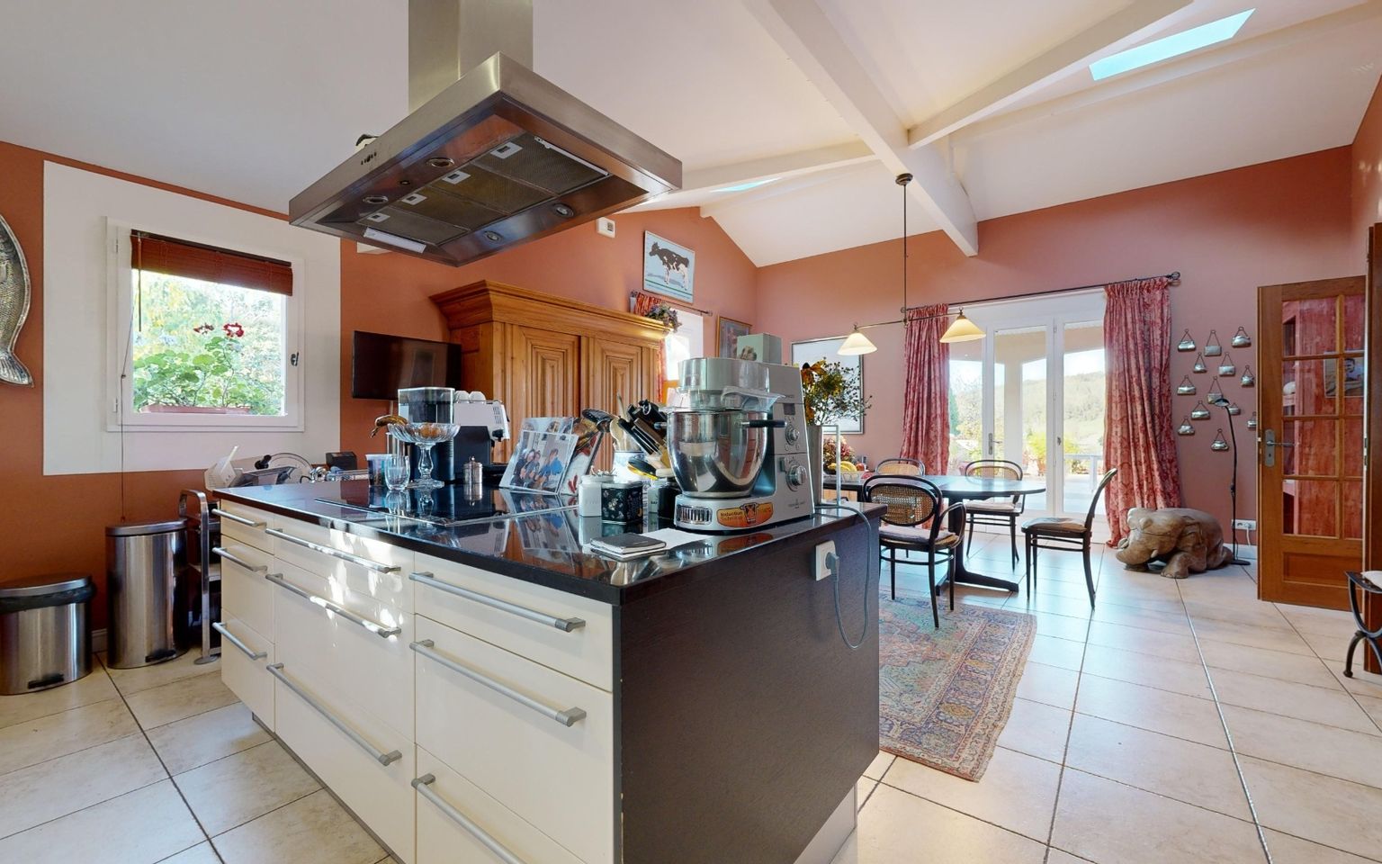 Bright living room with fitted kitchen opening onto a large terrace